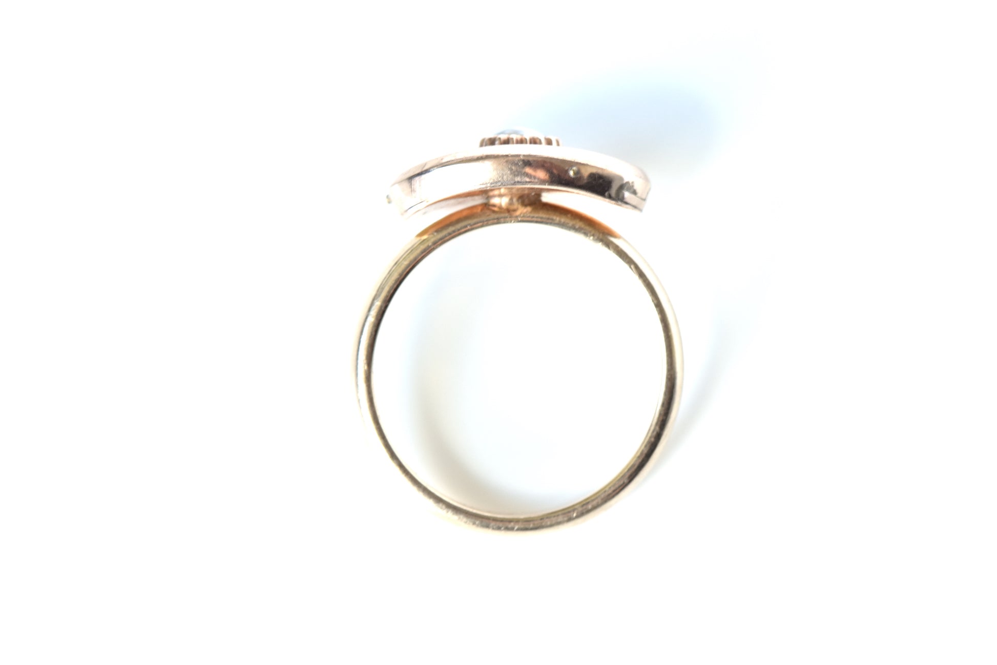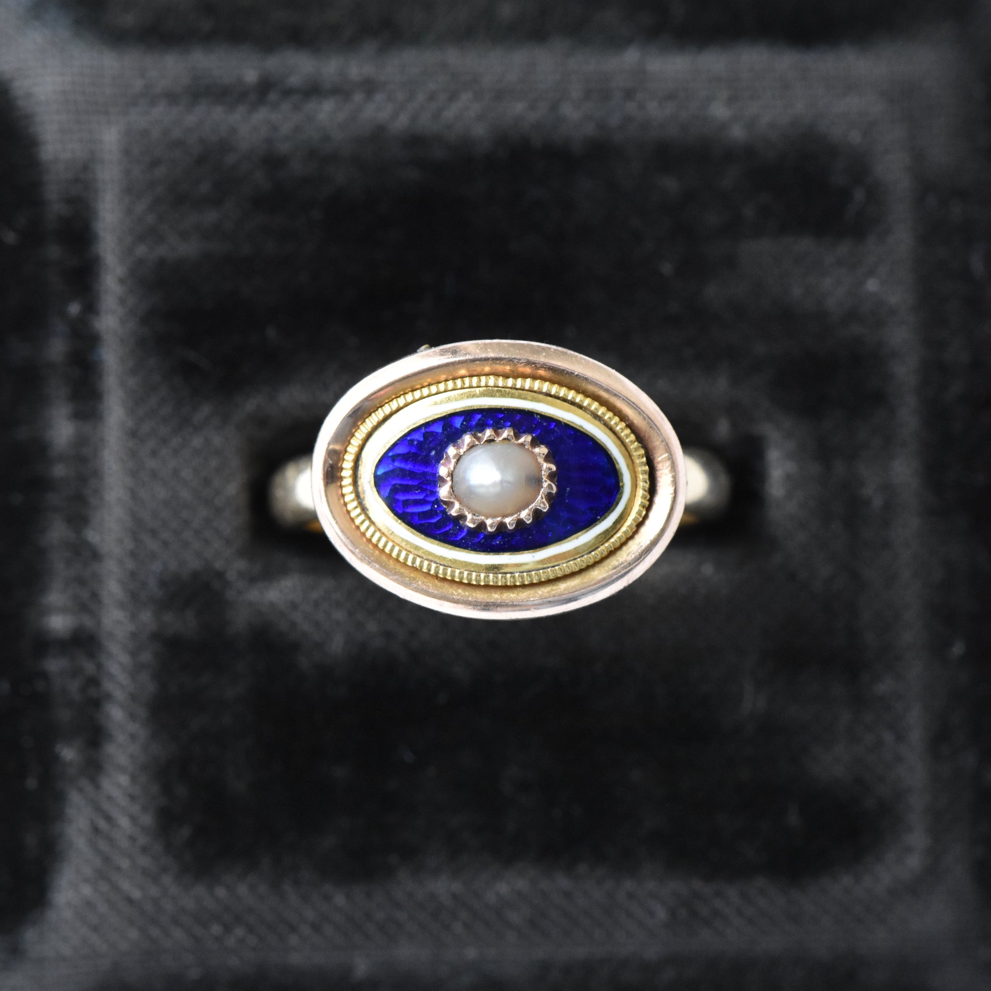 This ring is a bit of a Frankenstein, it was originally a clasp, then made into a stickpin, then made into a ring. But what it lacks in decision making, it makes up for in excellent quality enamelling, a beautifully collet-set pearl, and the evil eye vibe.