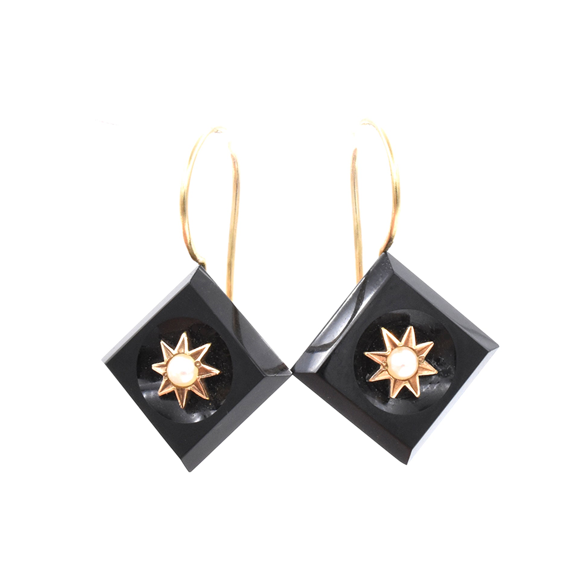 Onyx and pearl are like long lost sisters. They're opposites that compliment each other so well, as seen in these Victorian era earrings. The onyx is set on a diagonal and is separated from the pearl by an 8-pointed star setting. The star setting adds a special detail to an otherwise simple set of earrings.