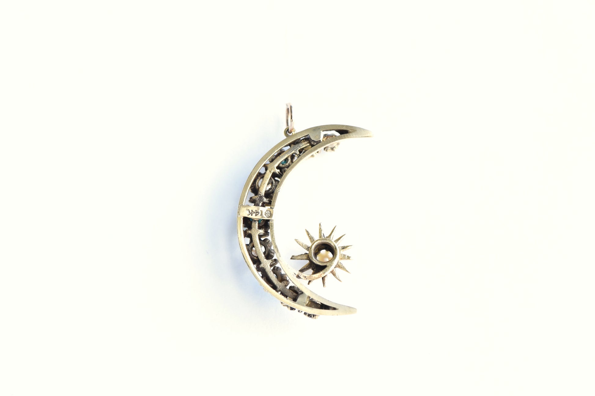 Description: Vintage turquoise and pearl crescent and star crafted in 14K yellow gold. Made by Sydney Berman Co. and newly converted from a brooch to a pendant.