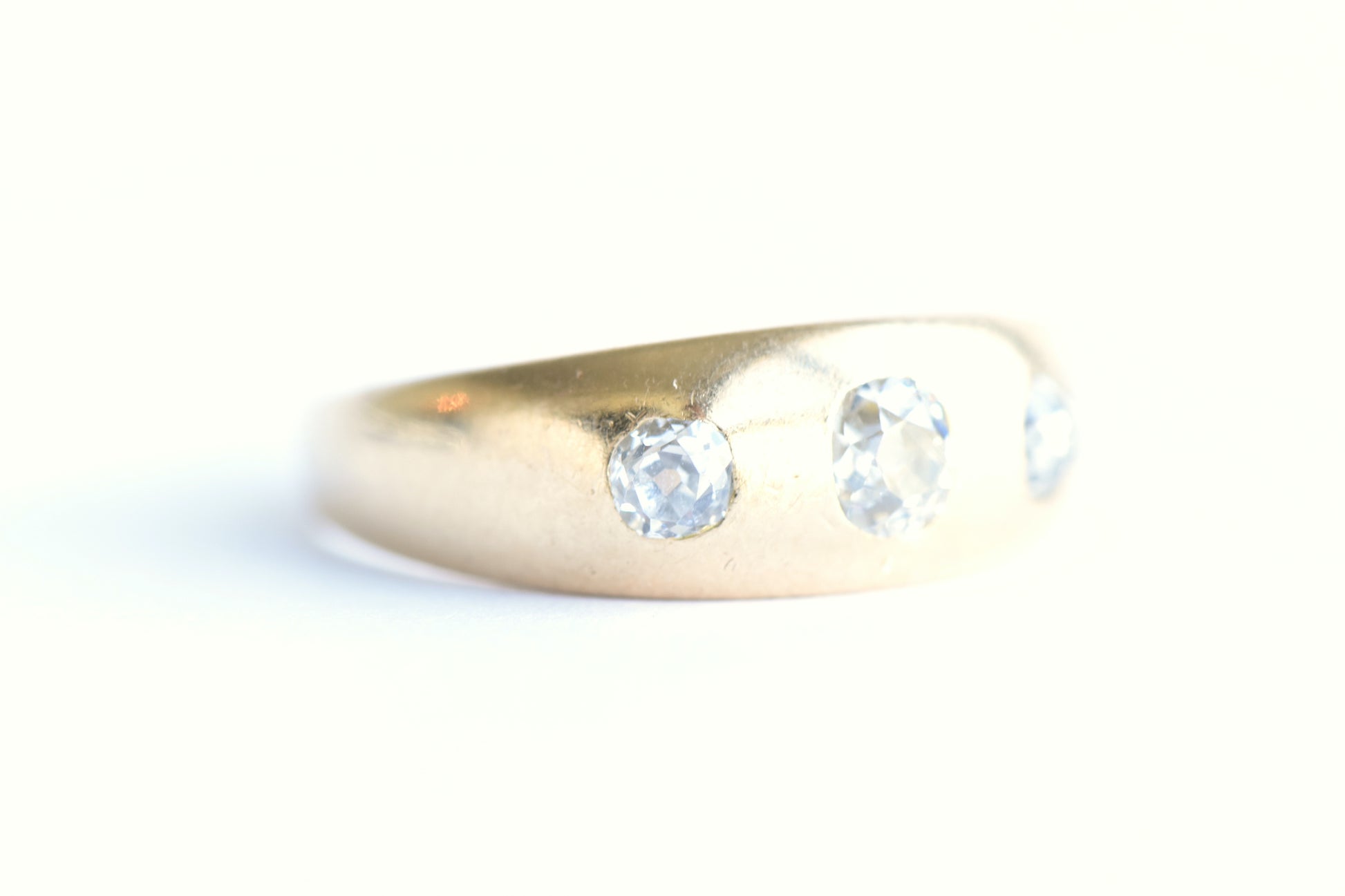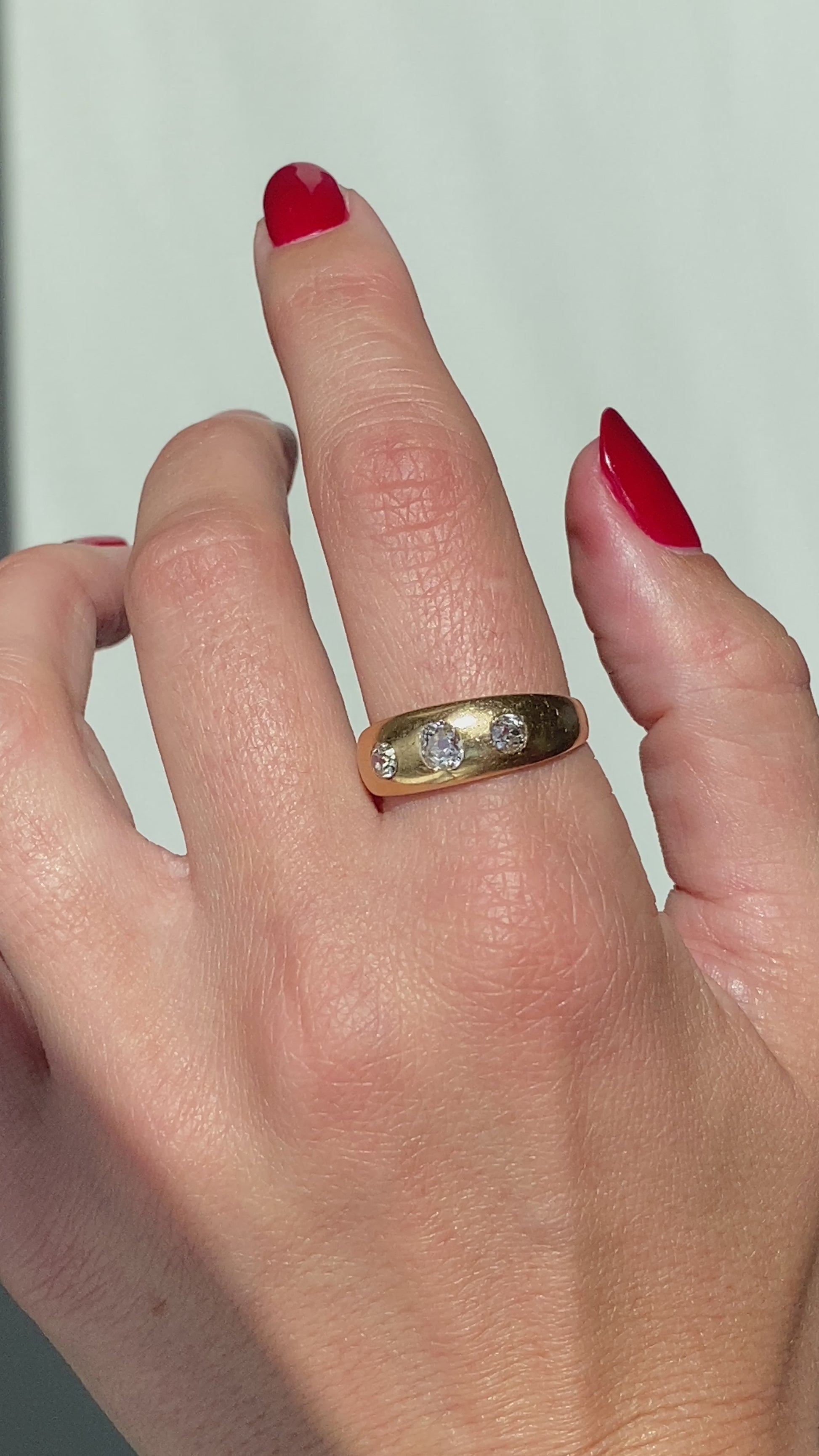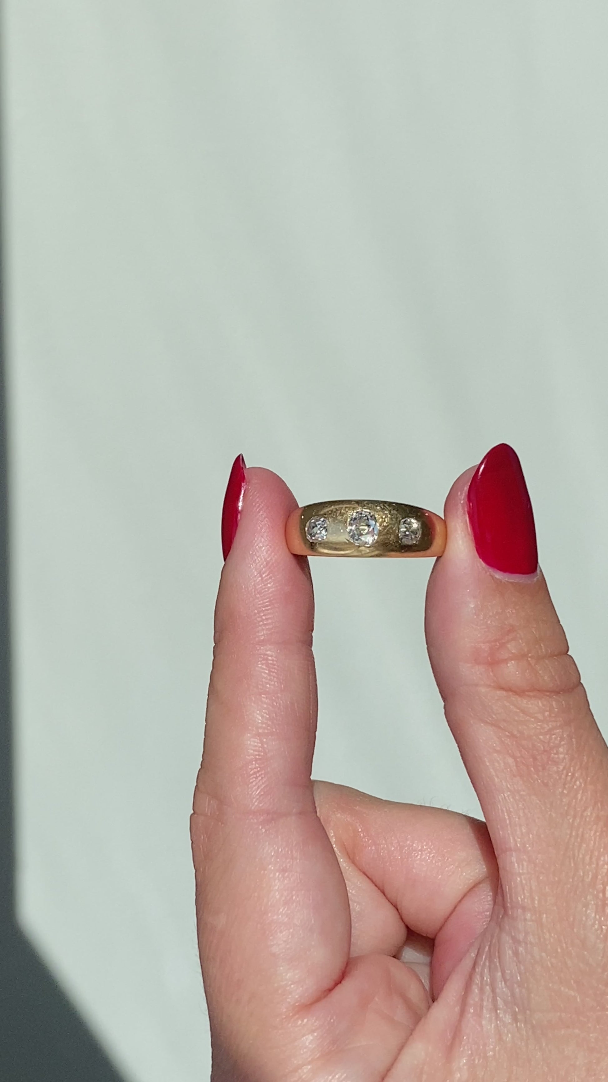 Description: Victorian gypsy trilogy ring with 3 Old Mine Cut diamonds (est. 0.76ctw) in 18K yellow gold. Currently a larger size, will include a complimentary resize.