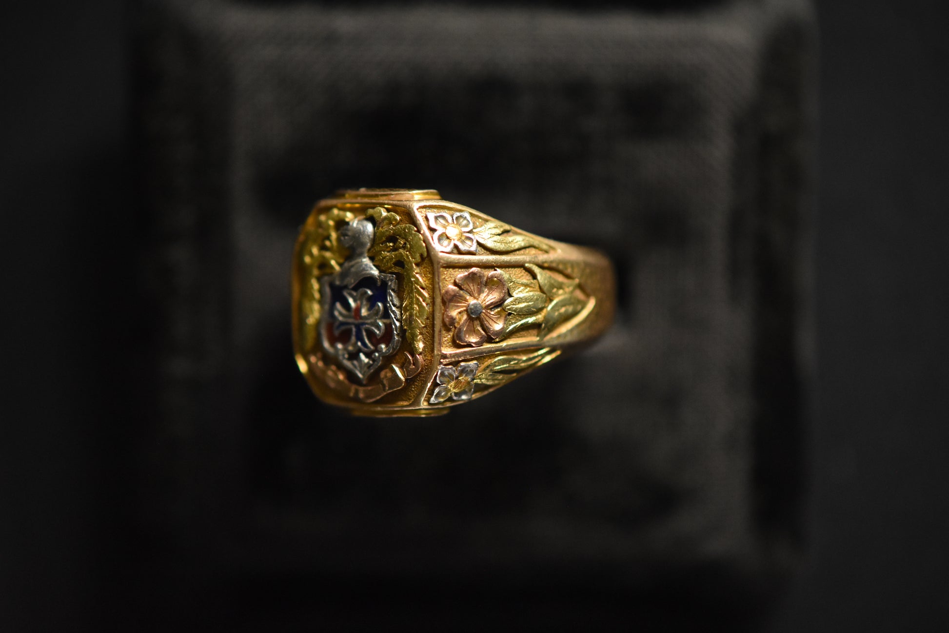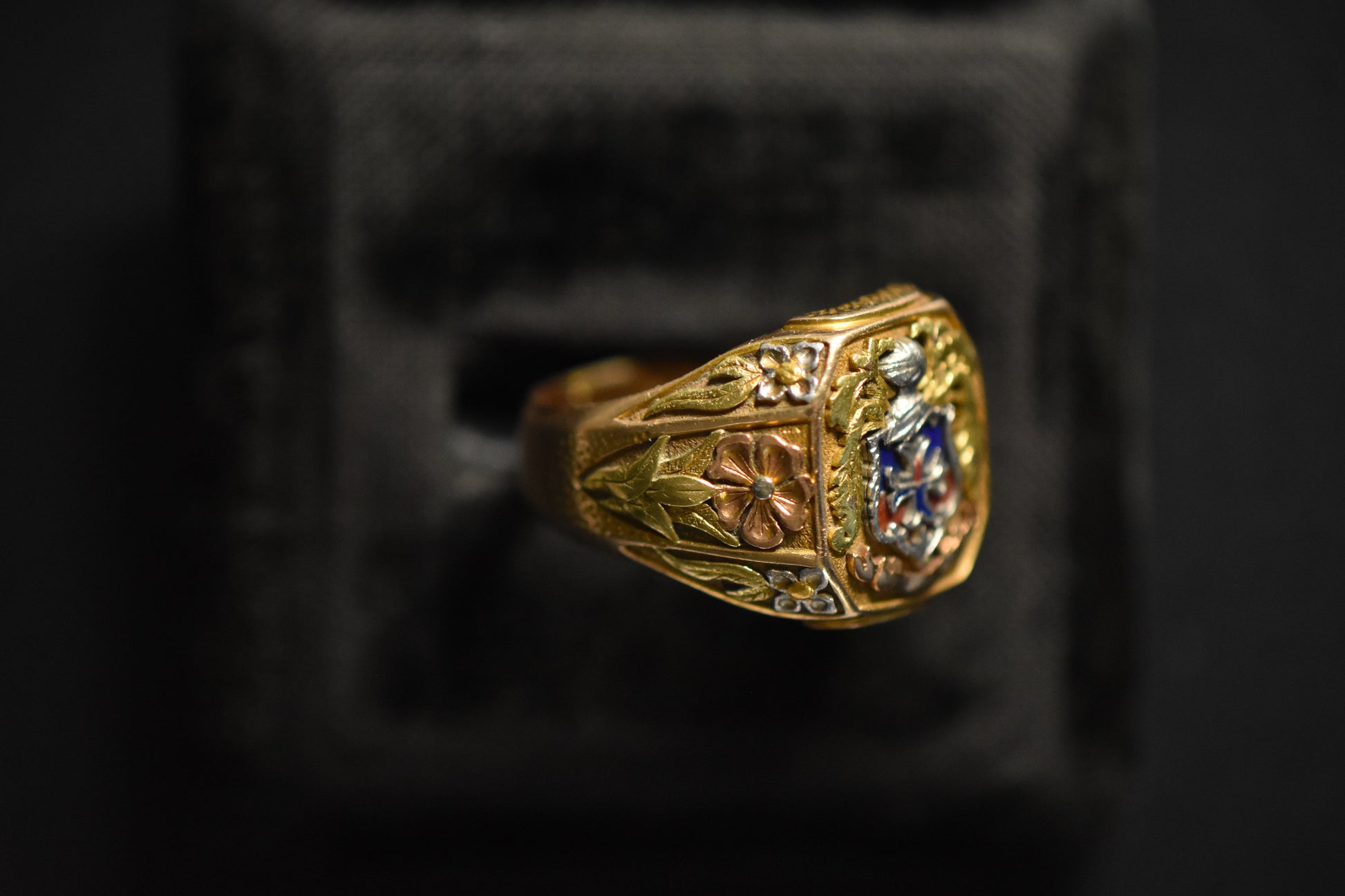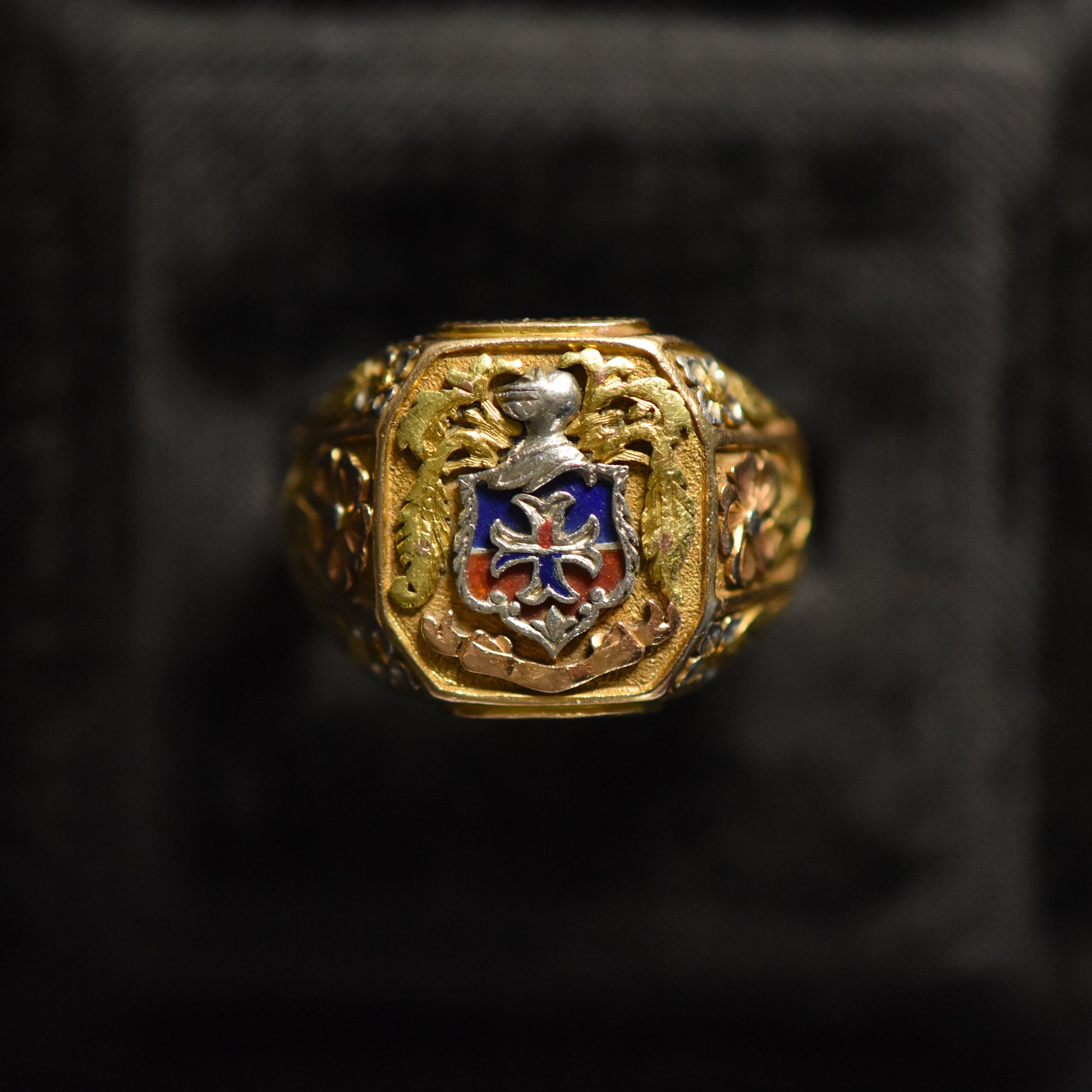 Exceptionally bold and heavy signet ring, with enameled coat of arms, and floral tri-color cold detailing on the shoulders. A ring of major presence.