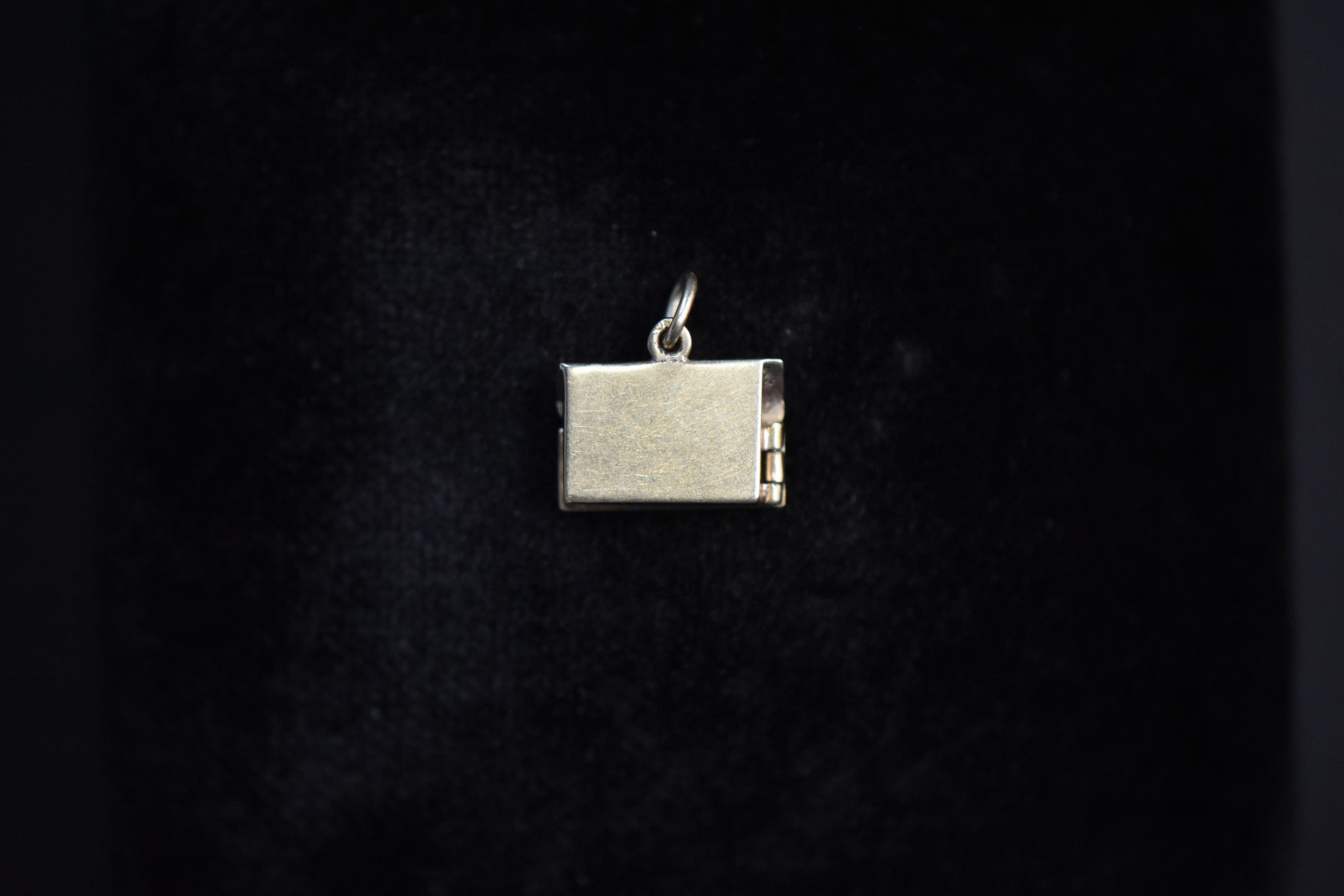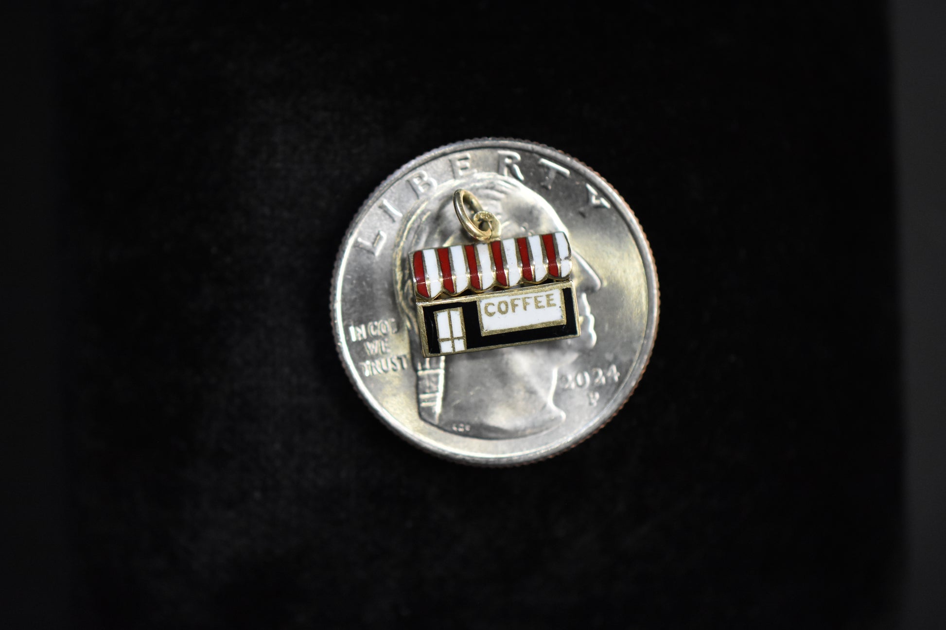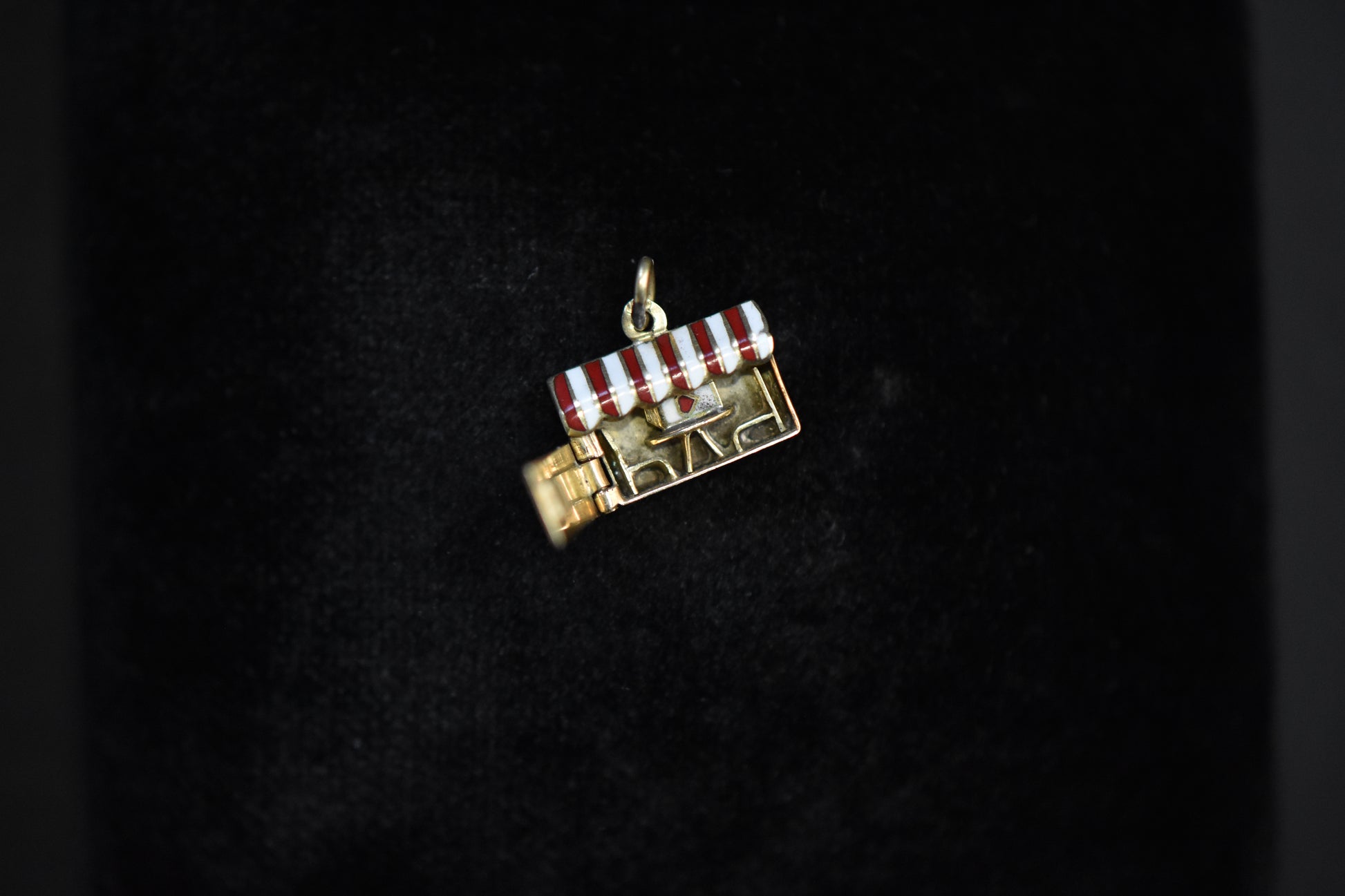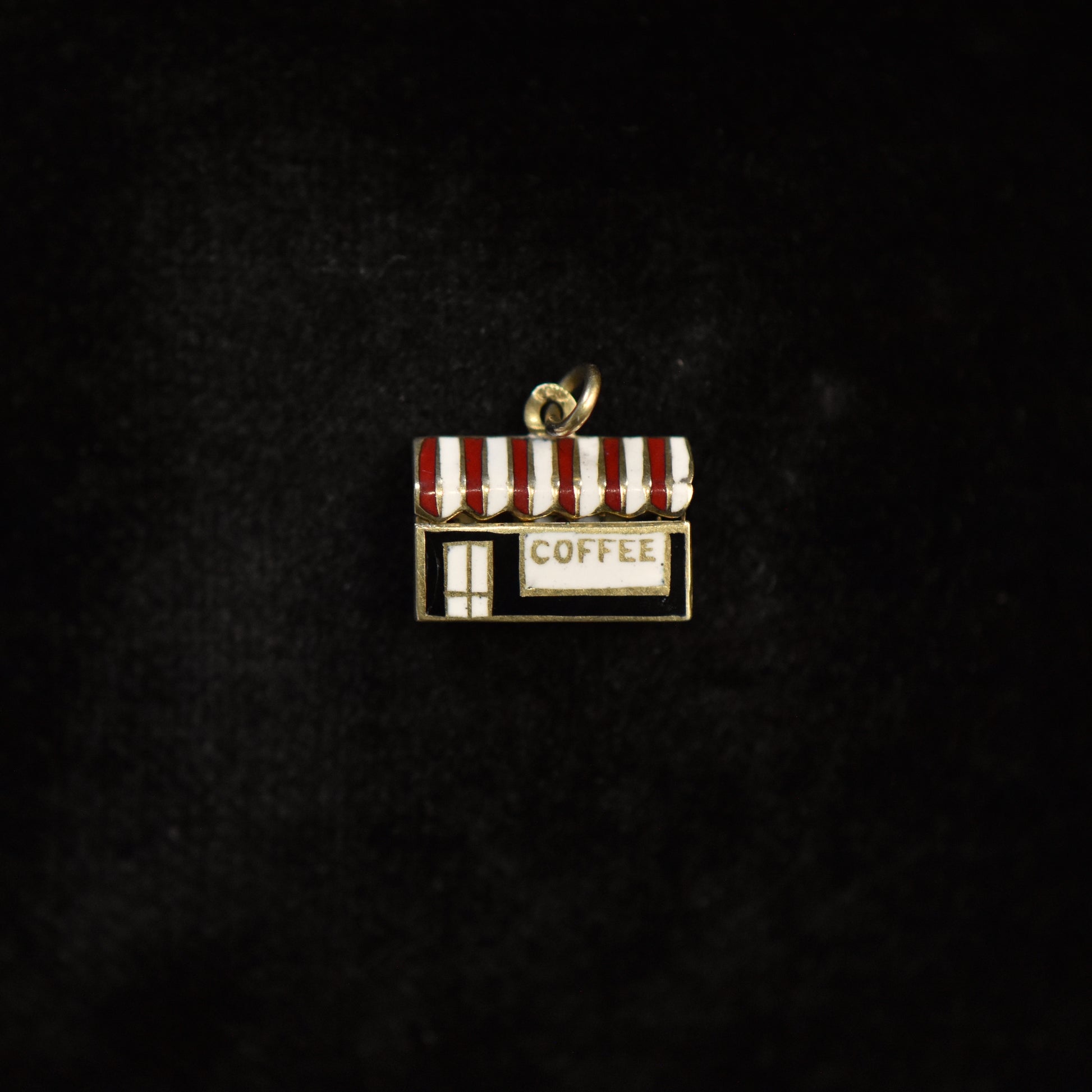 Adorable coffee house charm, with opening front to reveal a table, chairs, and coffee cup. Enamel is in perfect condition. Crafted in 14K yellow gold.