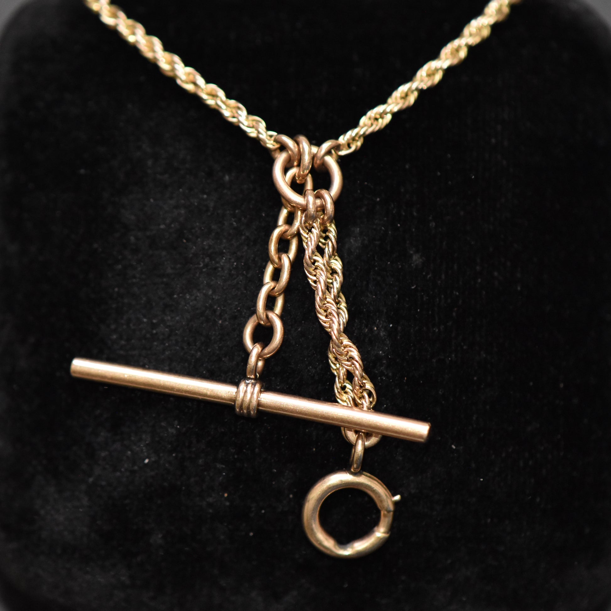 Antique rope link watch chain crafted in 14K yellow gold, with working dog clip and spring clasp, beautiful t-bar, and extra roping drop with spring clasp for adding your unique charms.