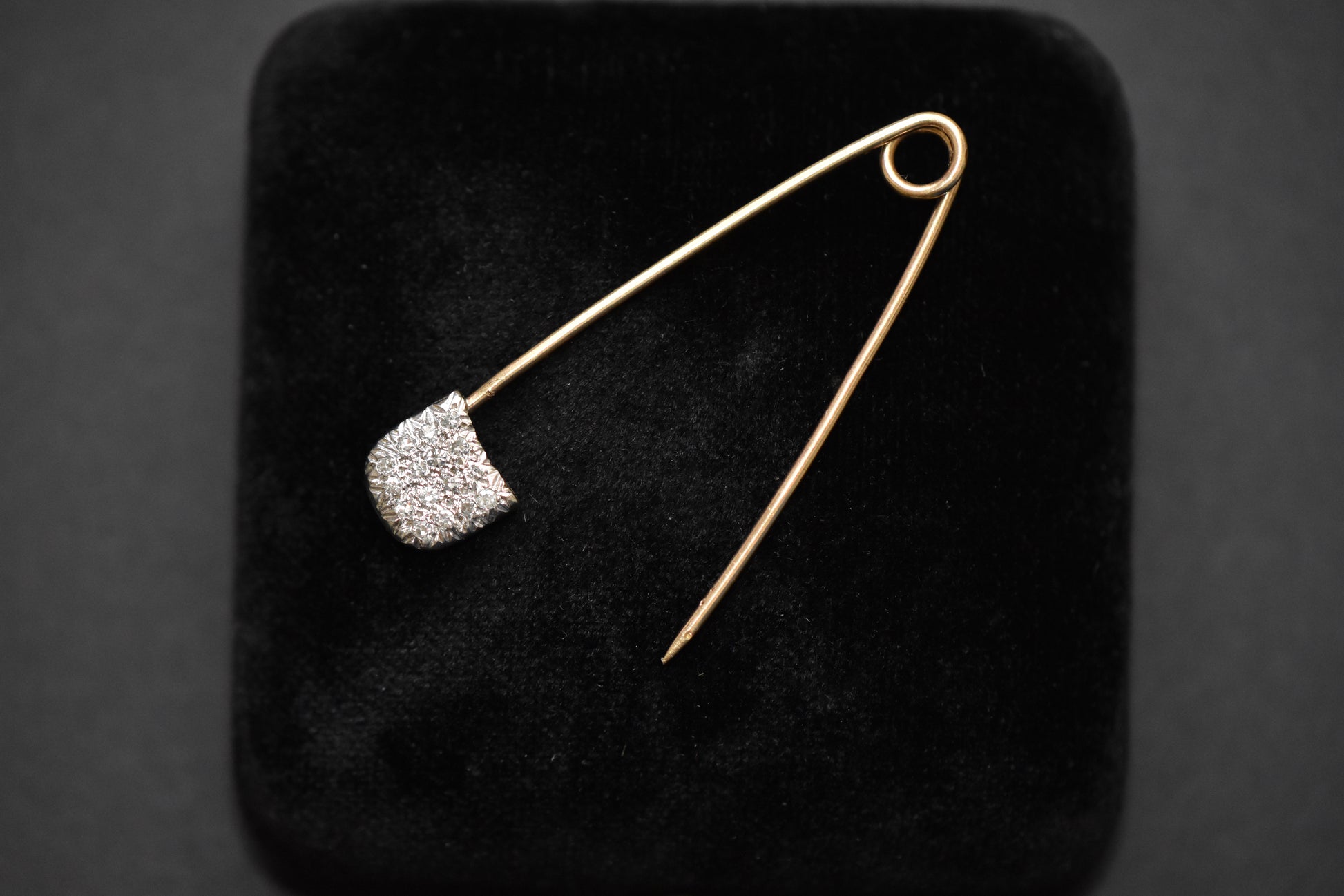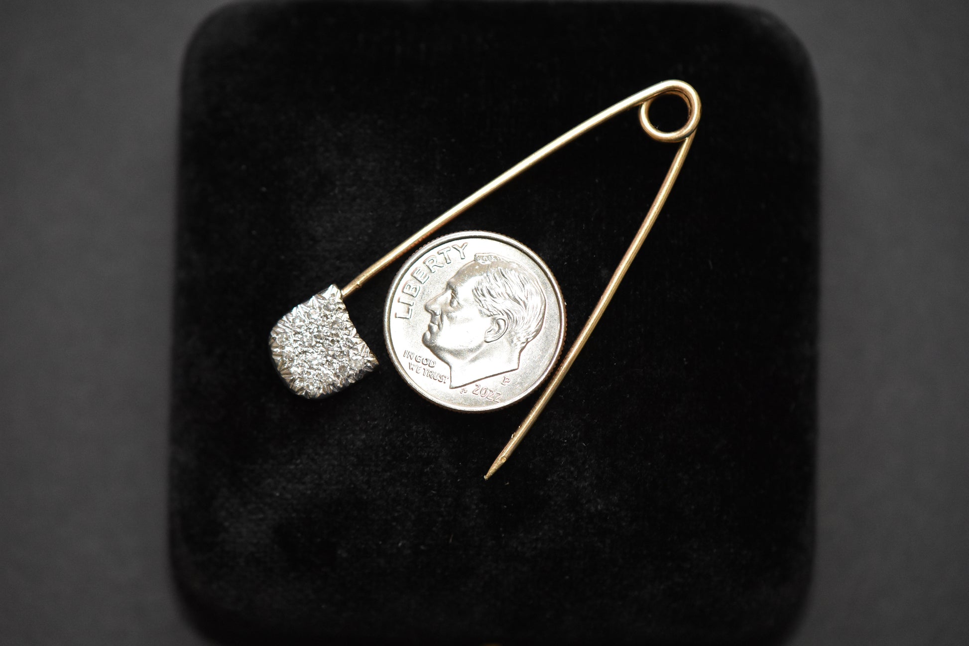 Versatile and playful safety pin crafted in two-tone 14K yellow and white gold, set with 16 diamonds in the head. Fully operational as a safety pin, opens and closes perfectly. Excellent for adding charms to any blazer or sweater, or to be used as a connector for your chain.