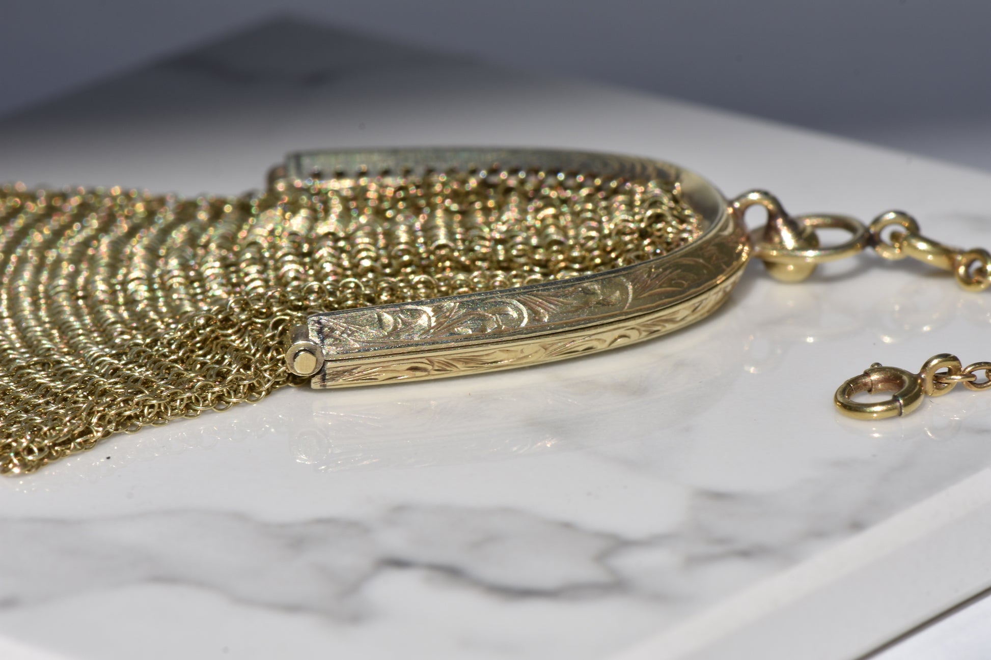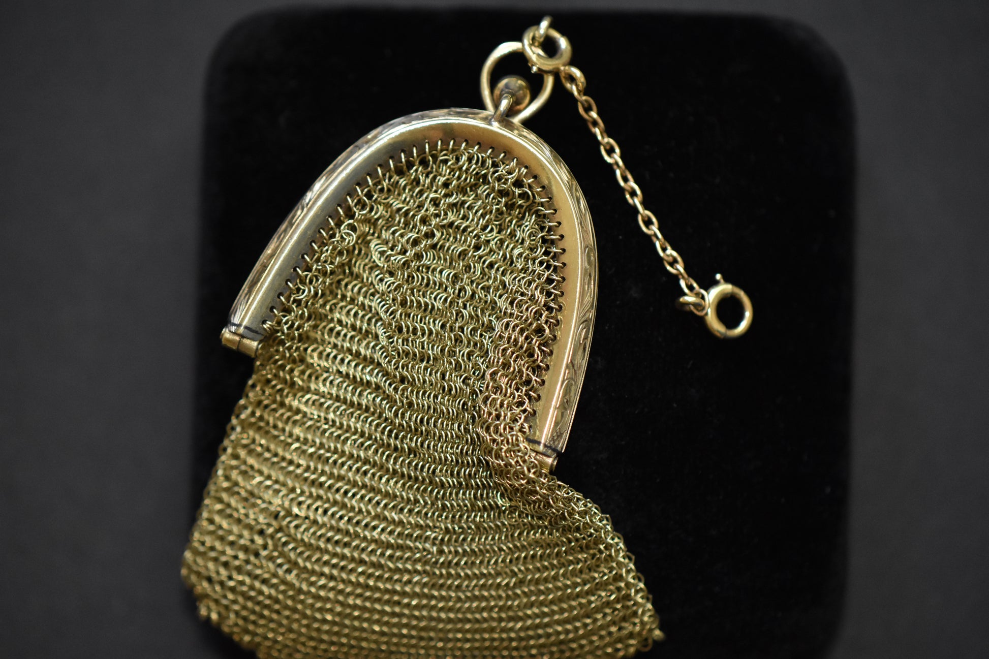 This pendant is an incredible opportunity to own one the coolest motifs in vintage and antique jewelry: Functional Jewelry. It is a fully working "purse" that opens and closes with a satisfactory click, and with room to fit one or two of your most prized petite treasures, you can now carry them close to your heart. Don't have anything sentimental to carry inside? Not to worry. Because the sultry, slinky movement of the mesh looks *primo* when empty. It sits close to the skin and glides with your every movement. This is what we mean whenever we use the terms eye-catching, gorgeous, or phenomenal.