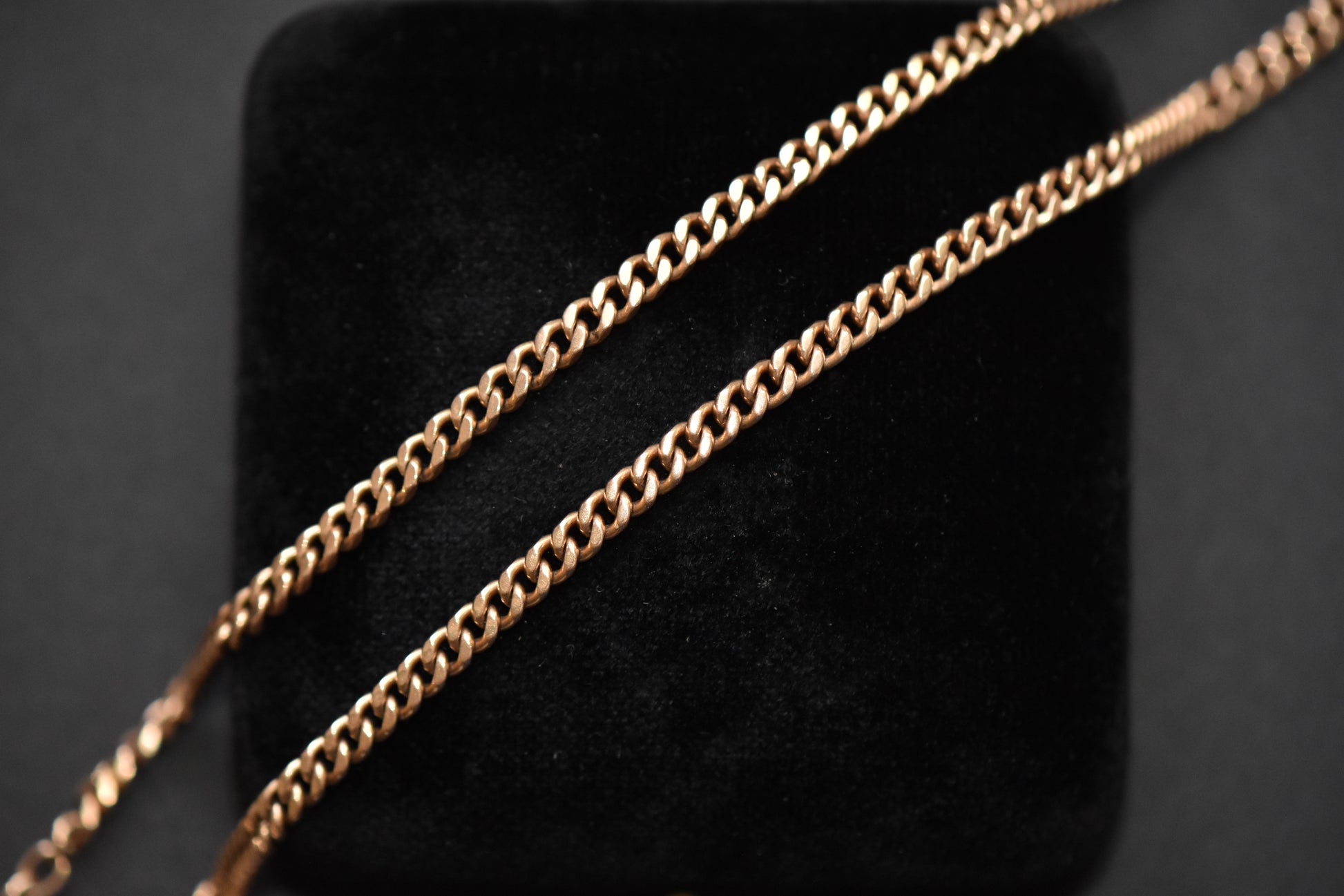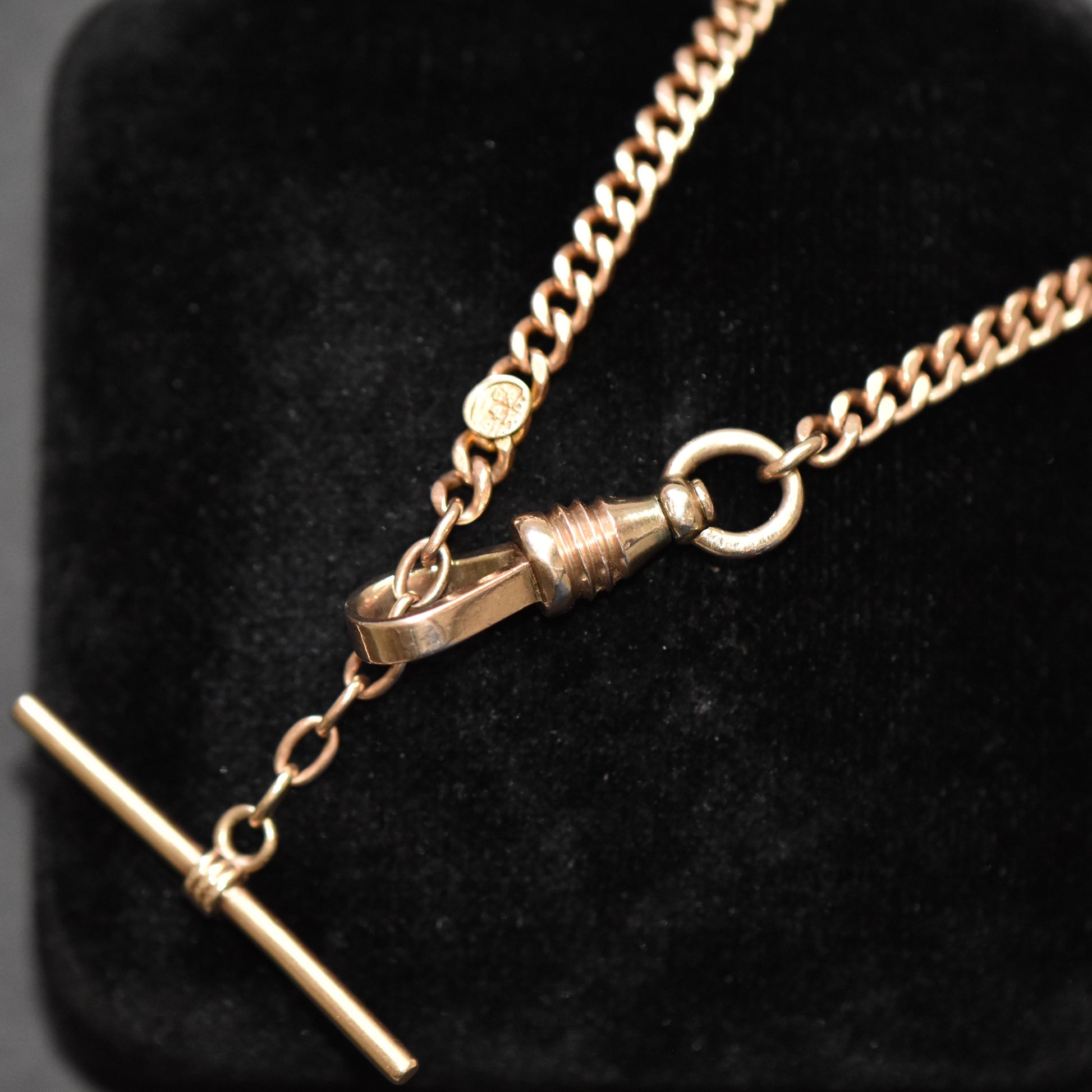 Classic antique curb link watch chain crafted in 14K rosy gold, with working dog clip and beautiful t-bar, making this watch chain a toggle style closure.