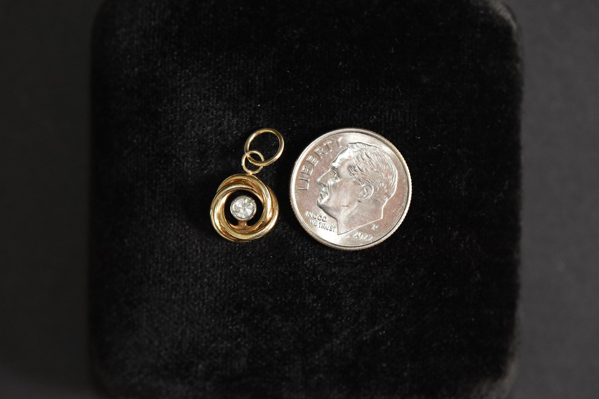 Petite diamond knot crafted in 14K yellow gold and set with a diamond, converted from a stick pin.