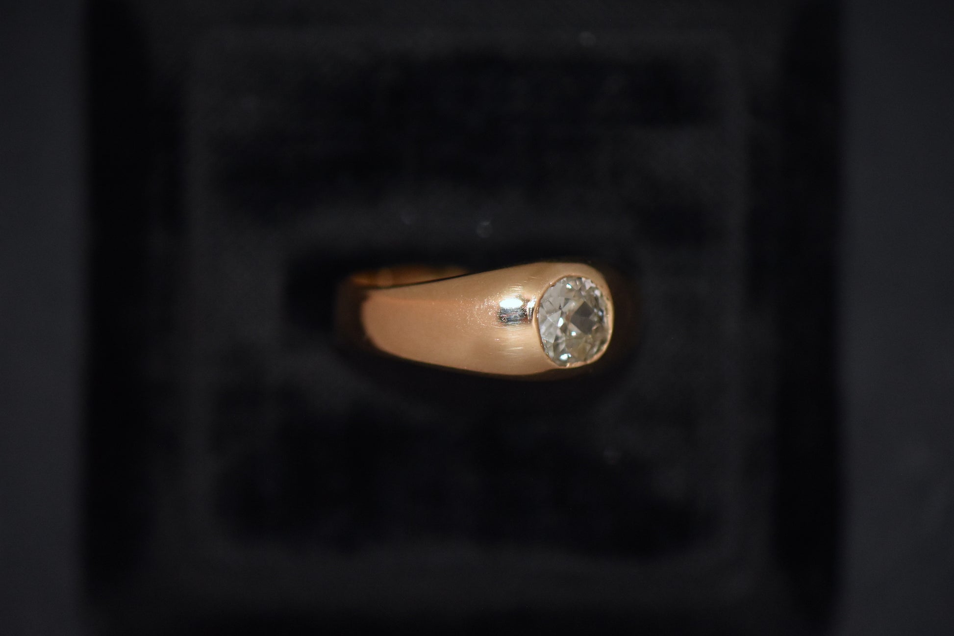 The juice is worth the squeeze with this antique 0.93ct Old Mine Cut diamond, crafted in a chunky 18K yellow gold flush set ring.