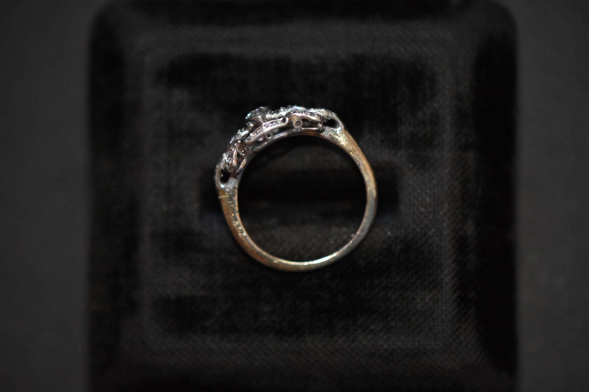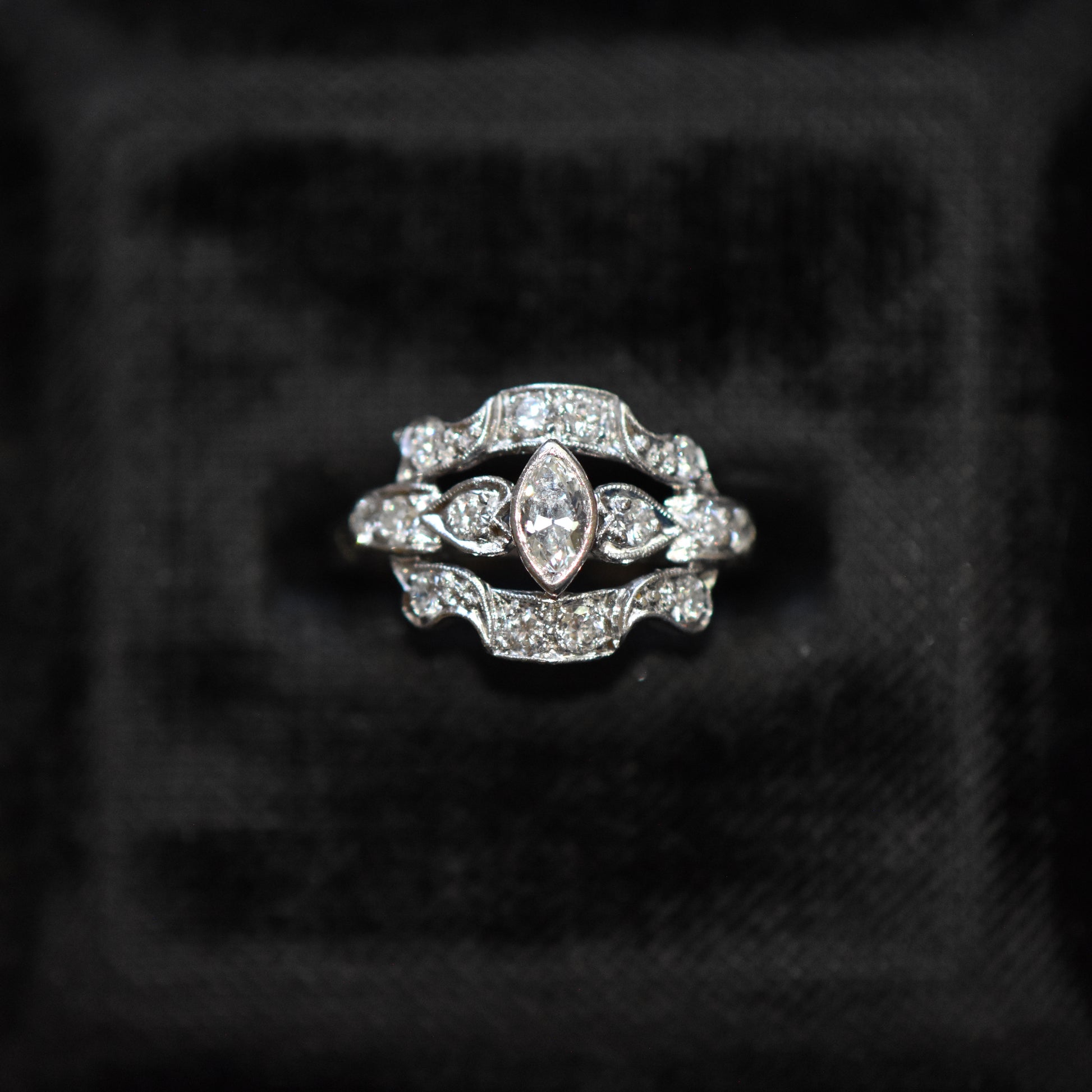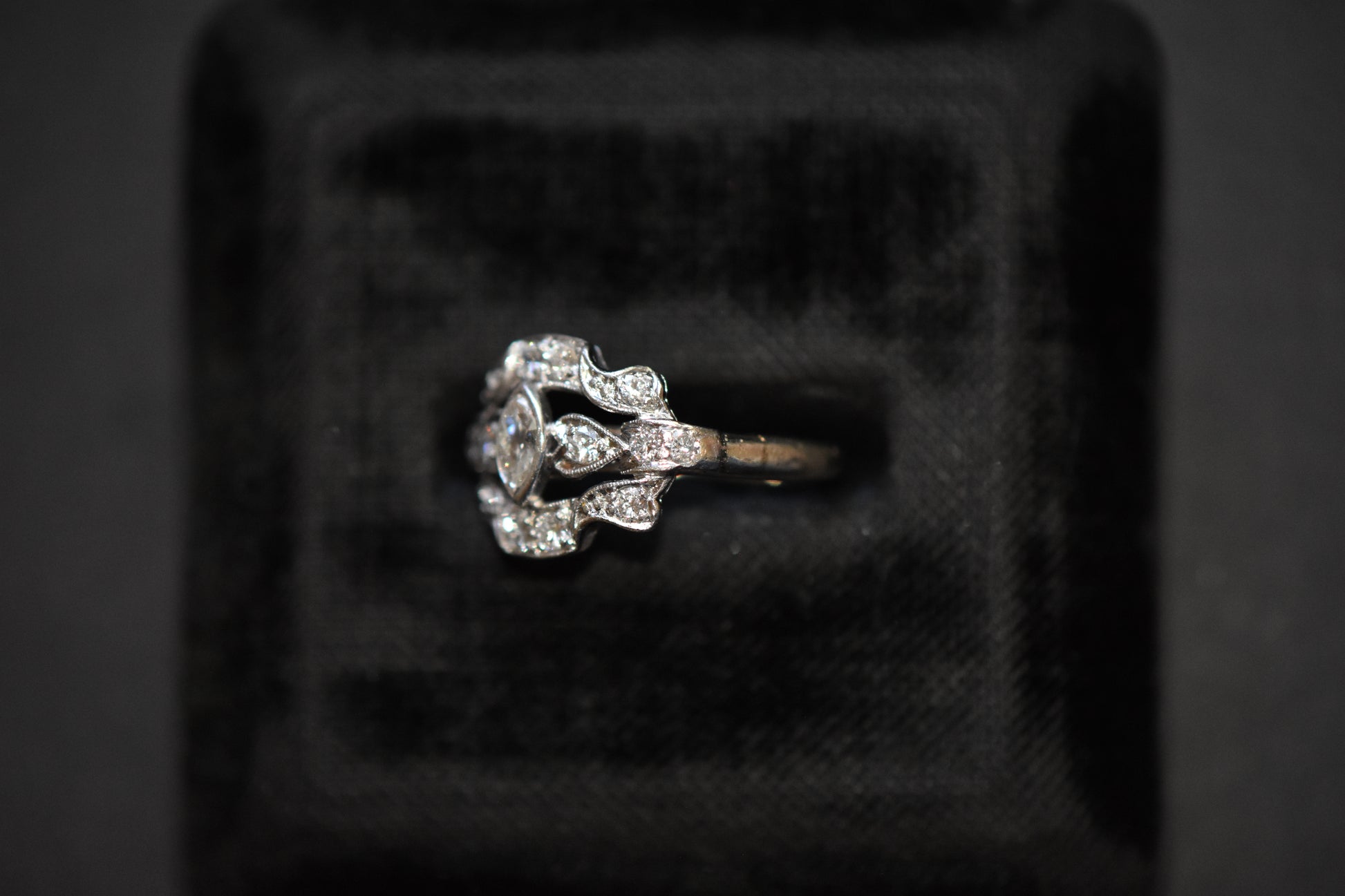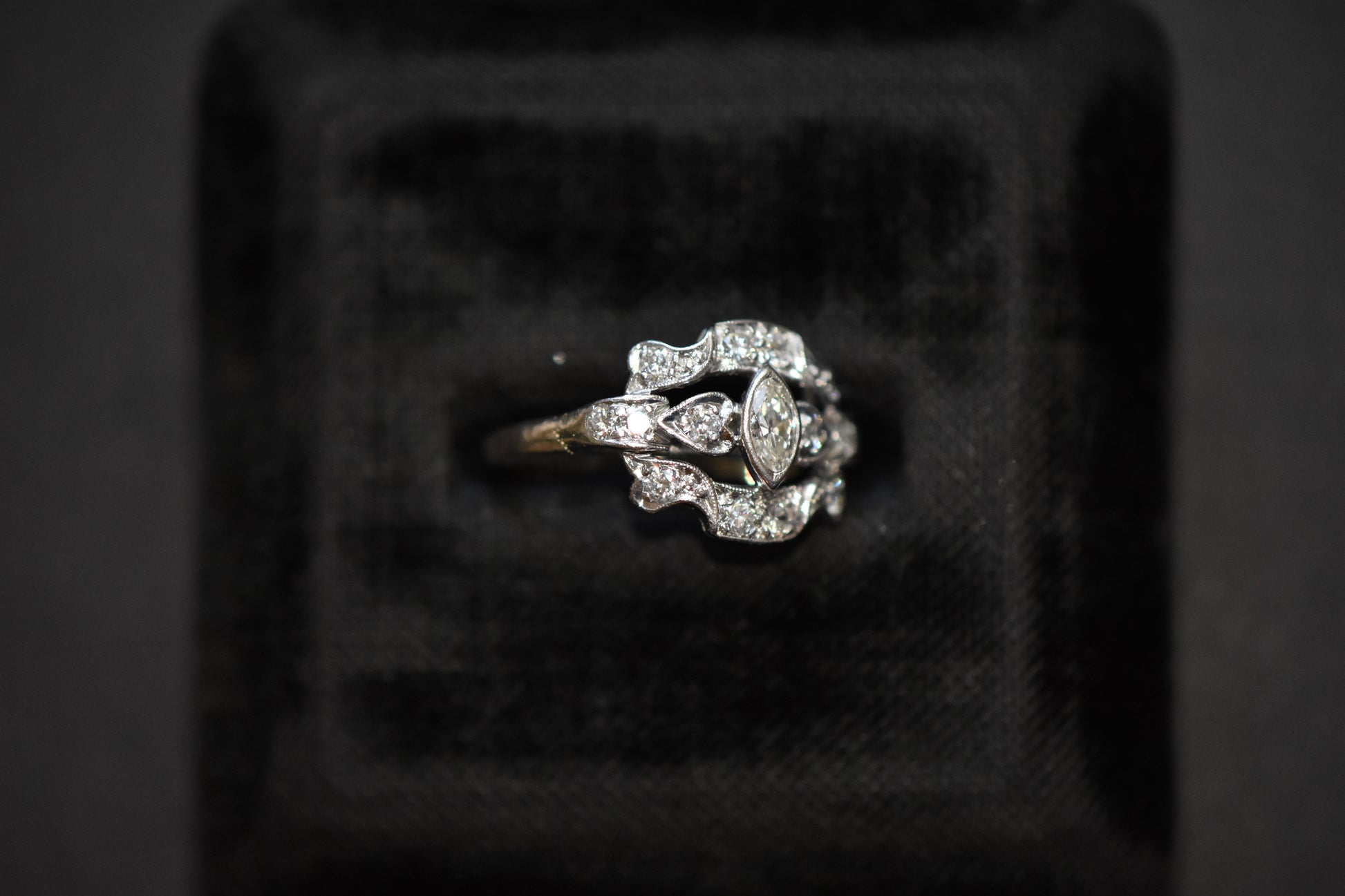 Antique Edwardian diamond ring set with a mix of antique cuts including a central marquise, and round cut diamonds. Crafted with a beautifully scalloped, scrolling setting.