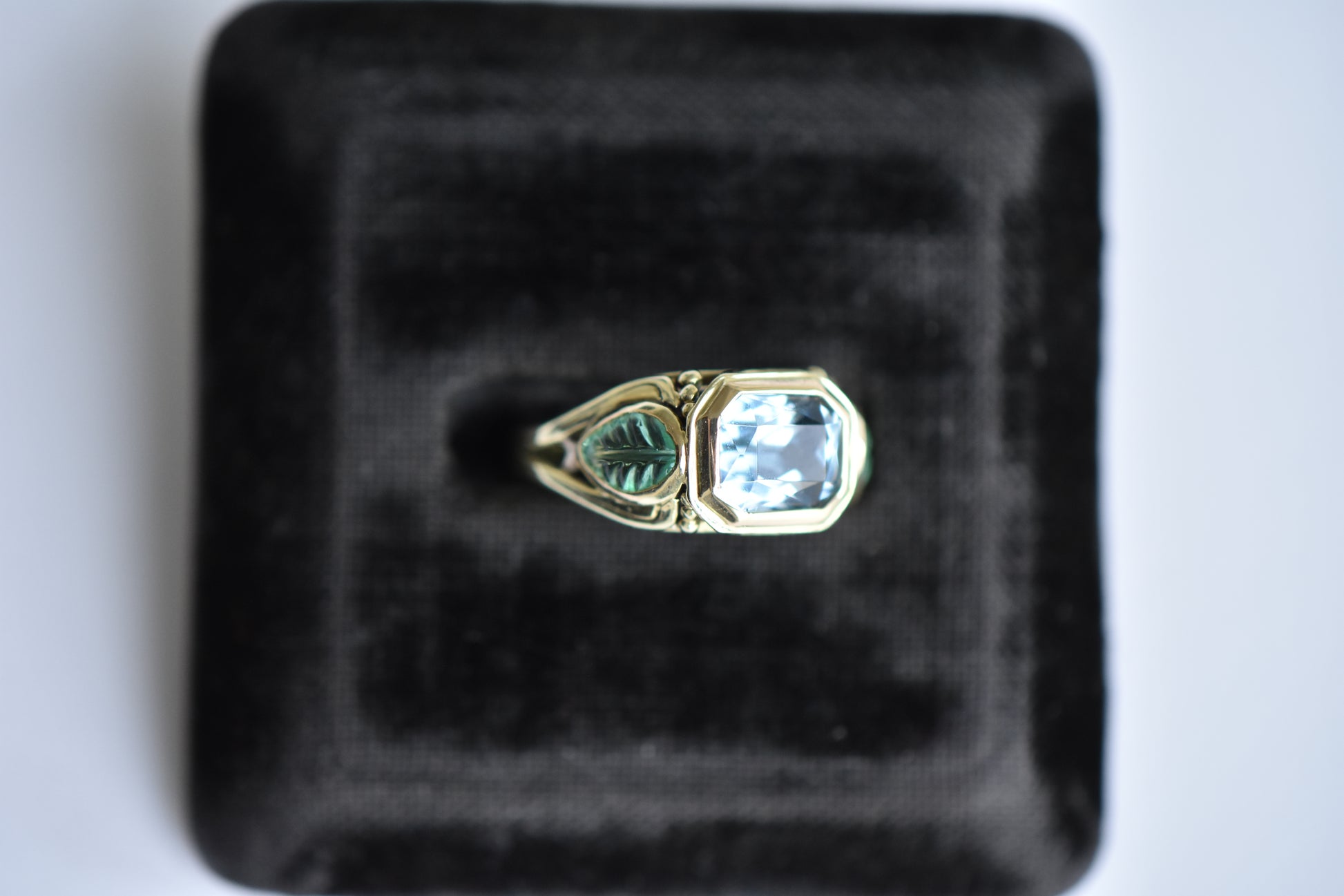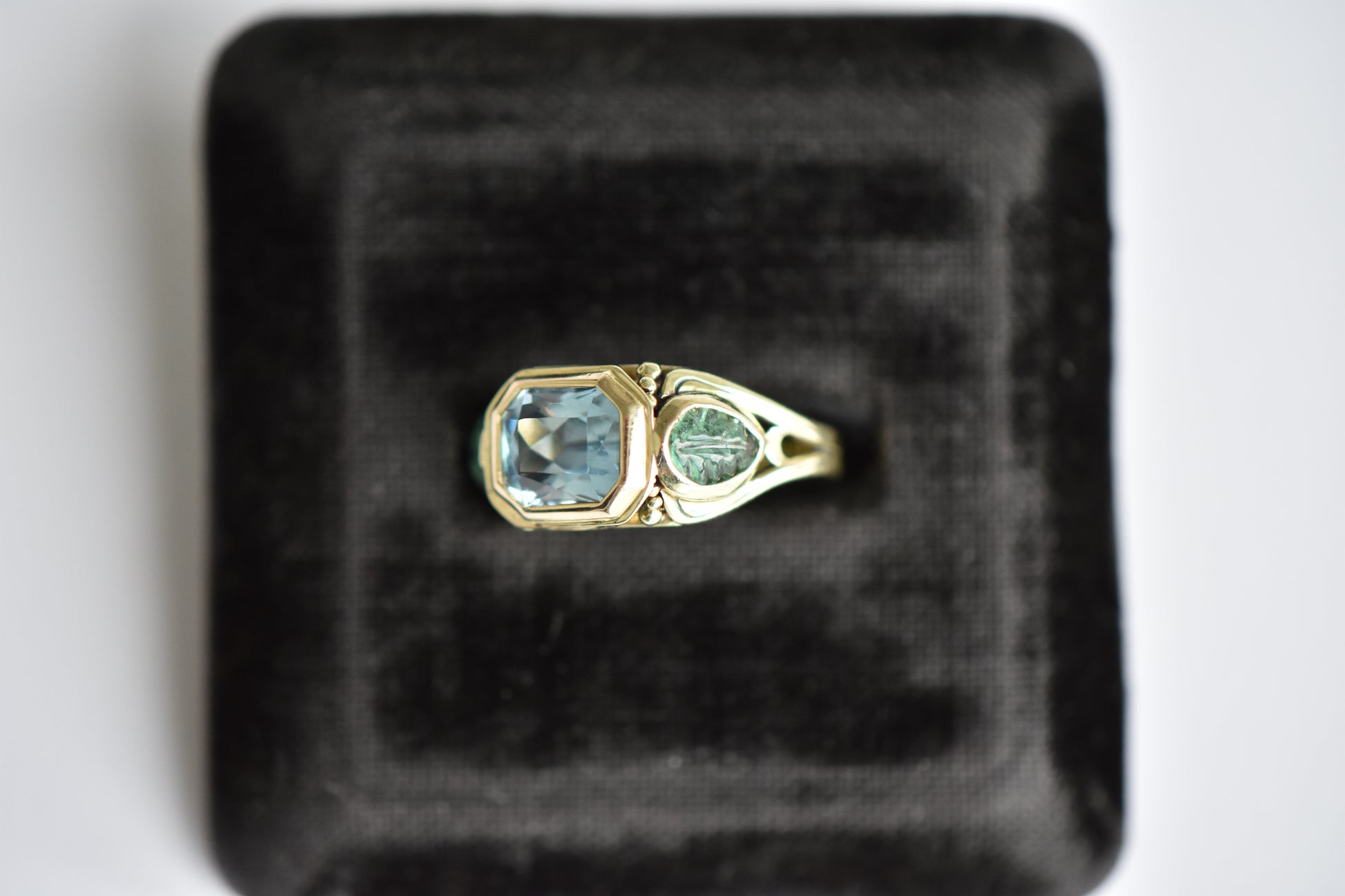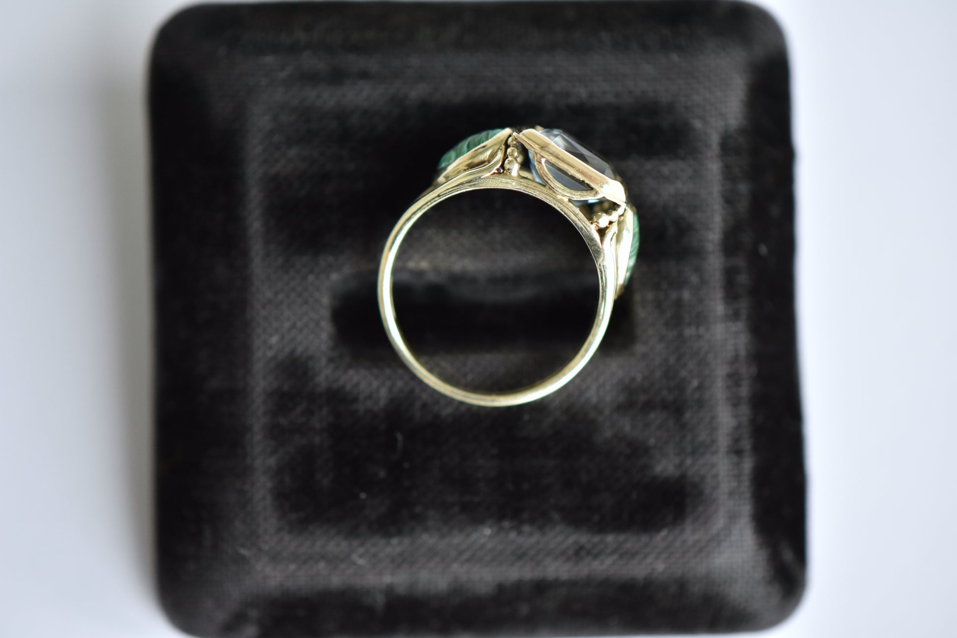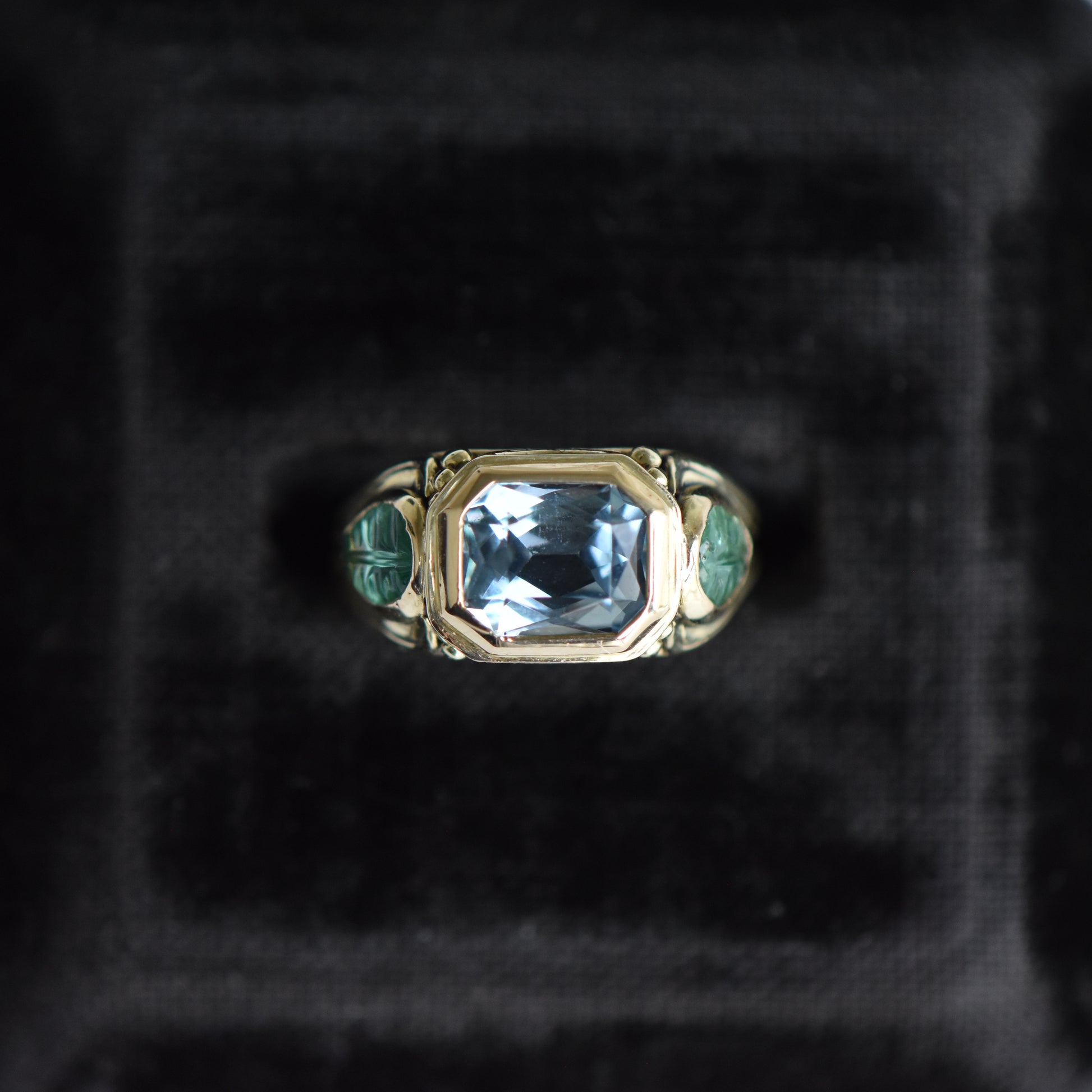 Arts and Crafts Aquamarine with Emerald & Spinel Leaf Ring in 14K Yellow Gold.