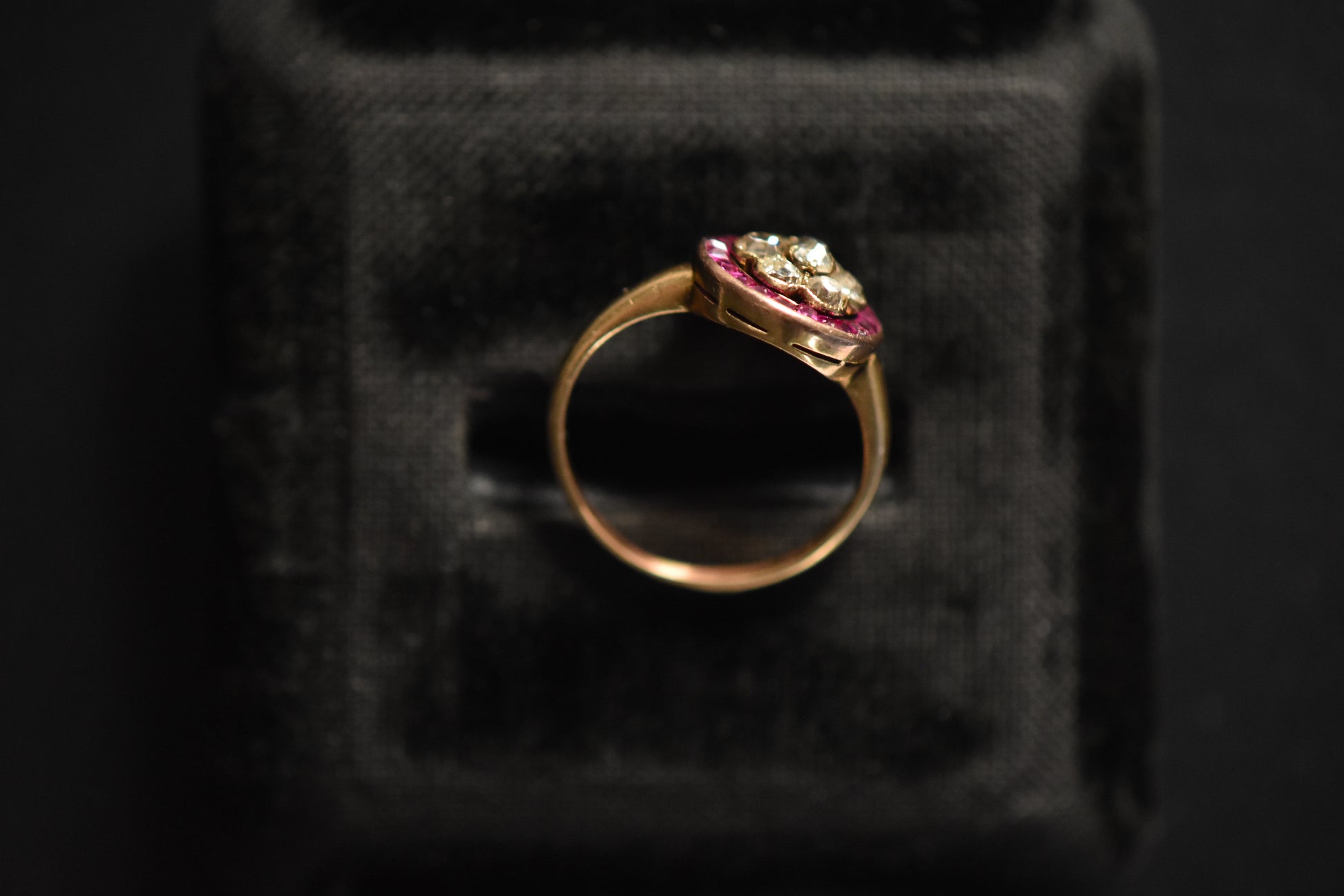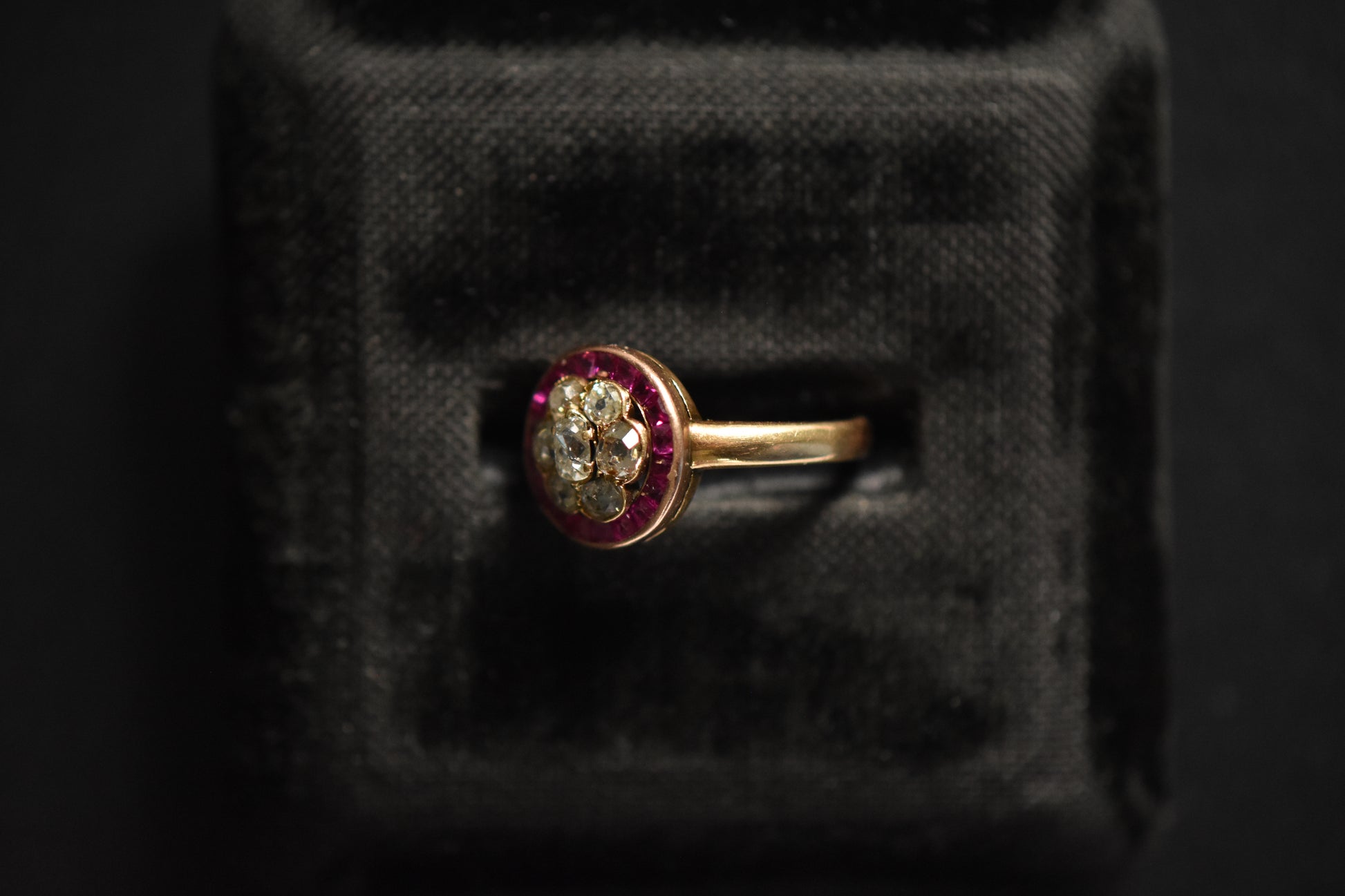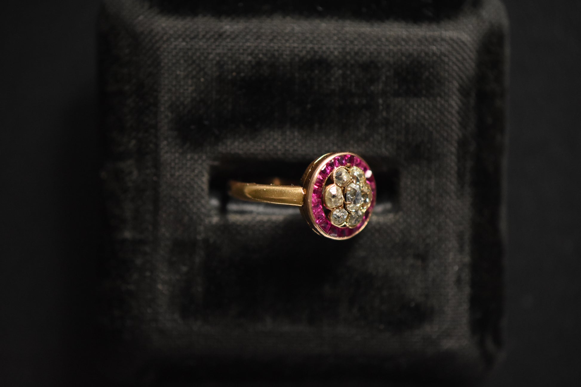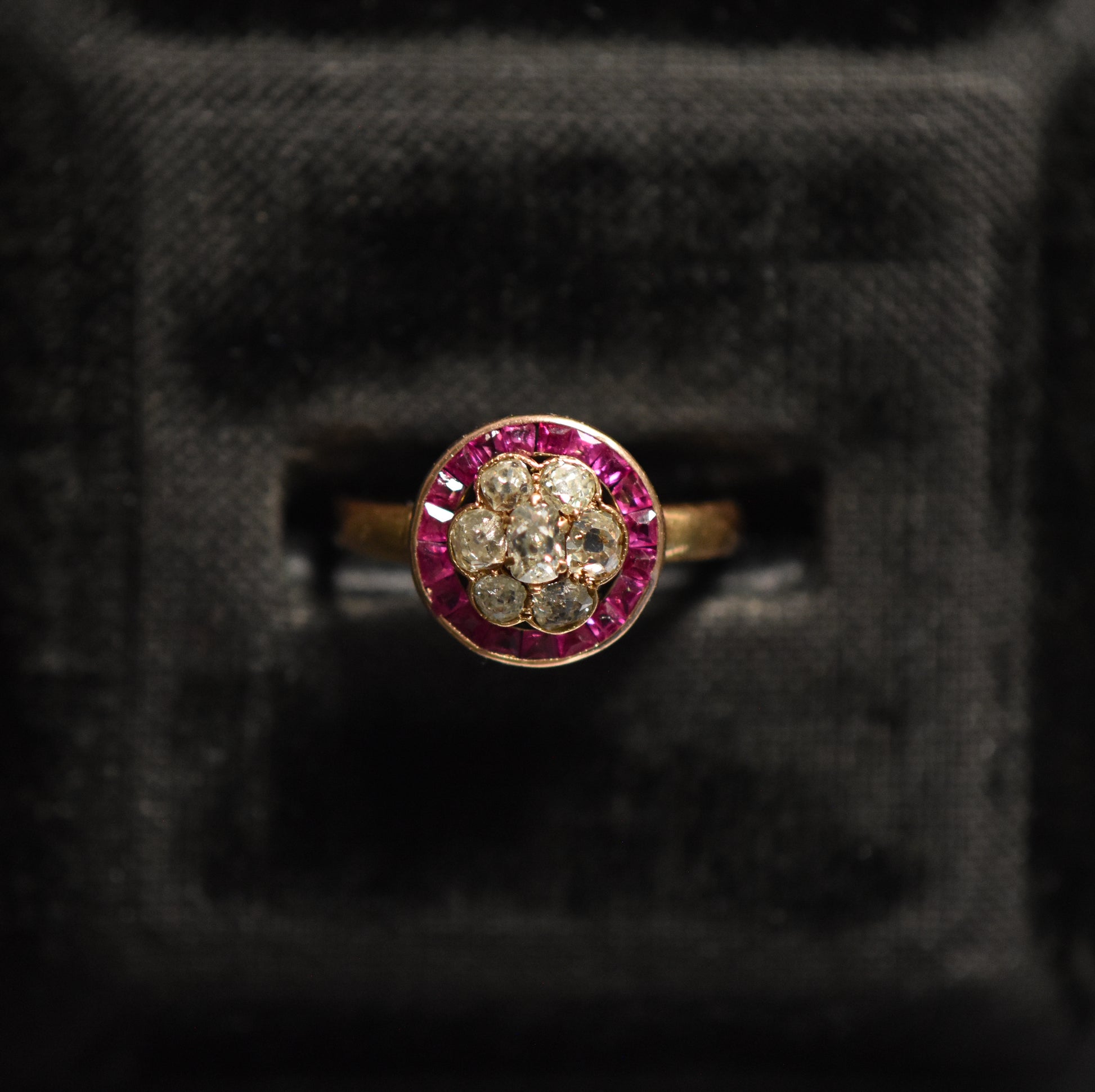 All the juicy details we love in an antique piece... chunky old cut diamonds, with calibre cut rubies in a halo around them. What more can you ask for!