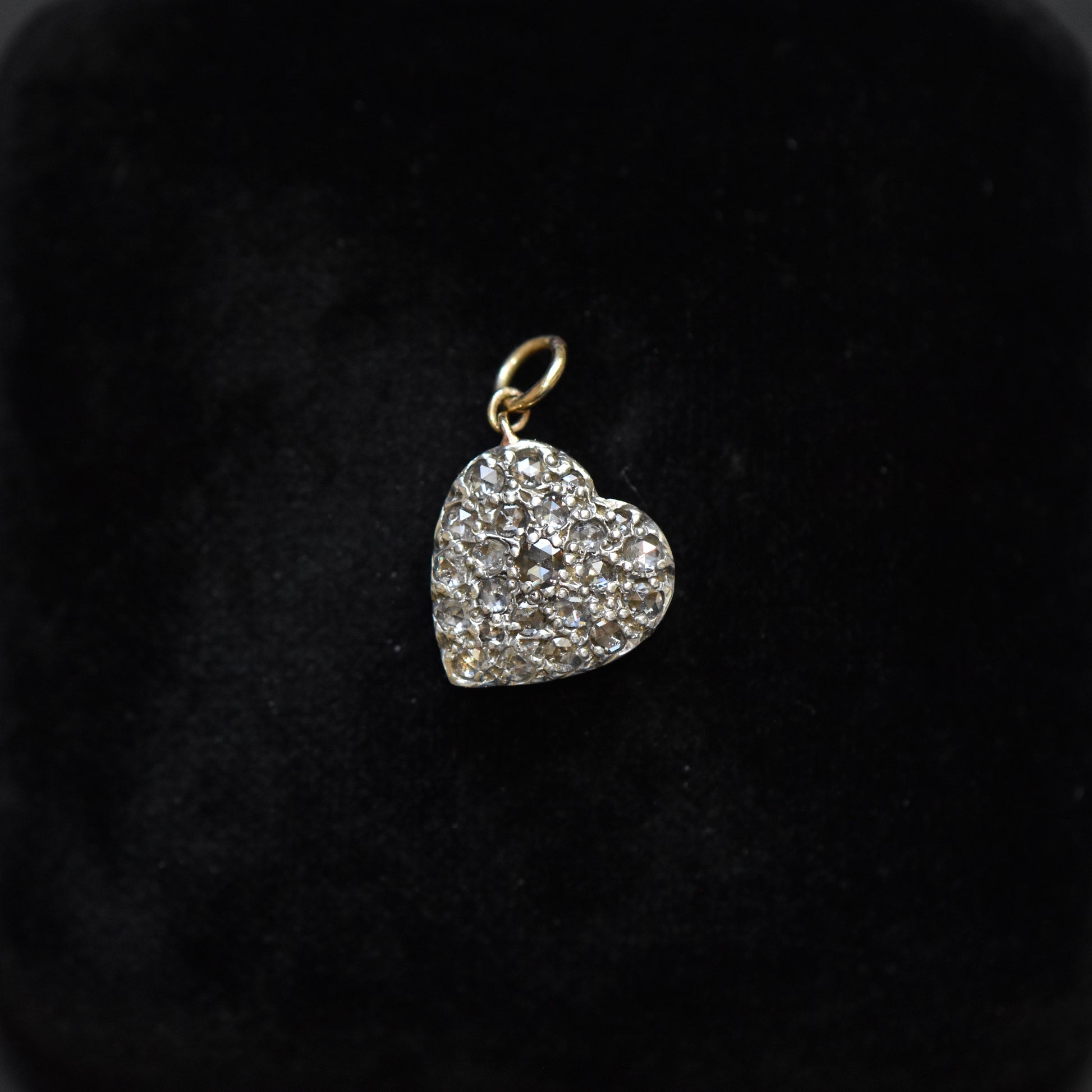 Sweet heart studded in moody rose cut diamonds, crafted in 10K yellow gold and silver. Peep the adorable heart detail on the reverse.