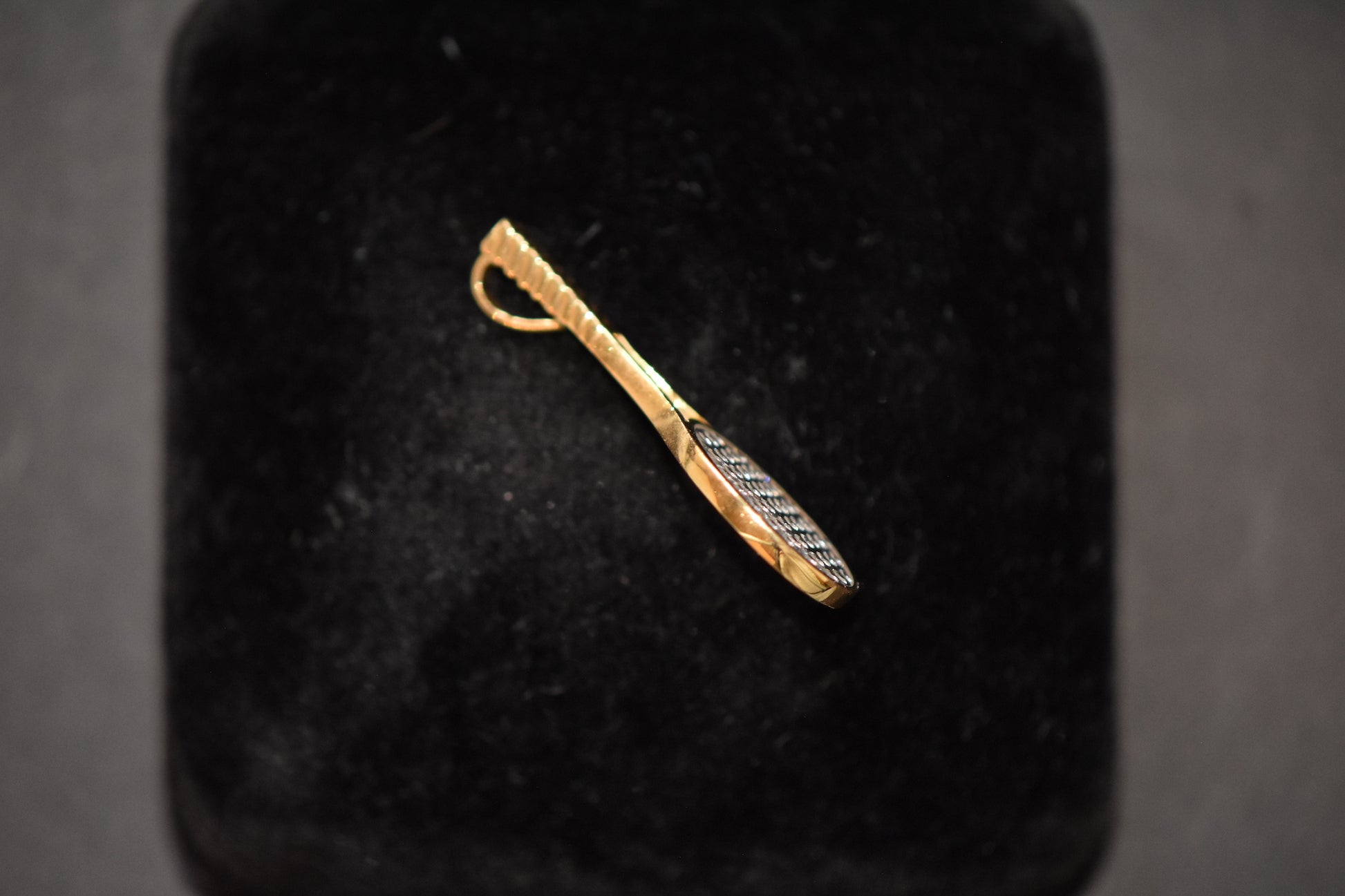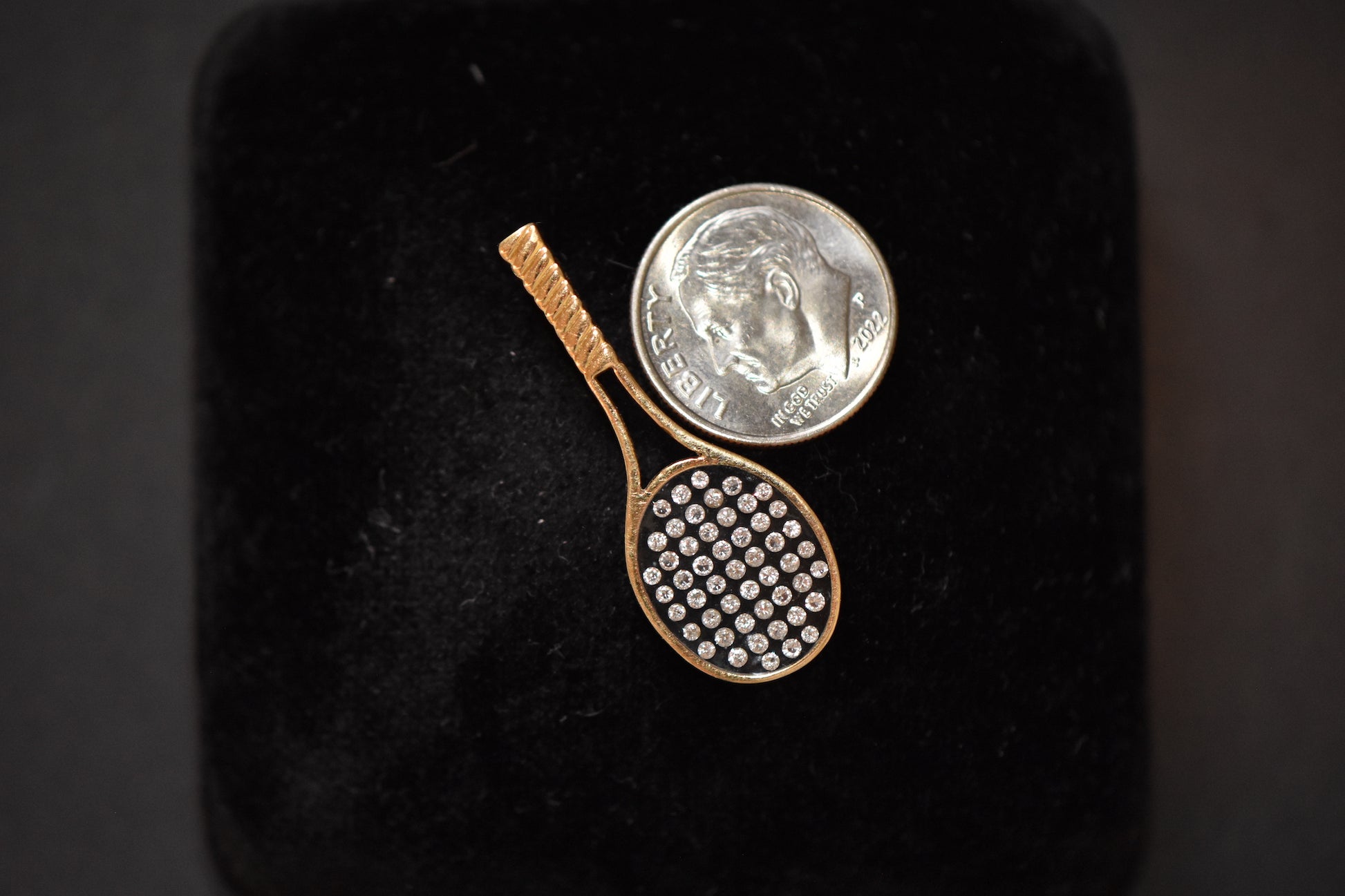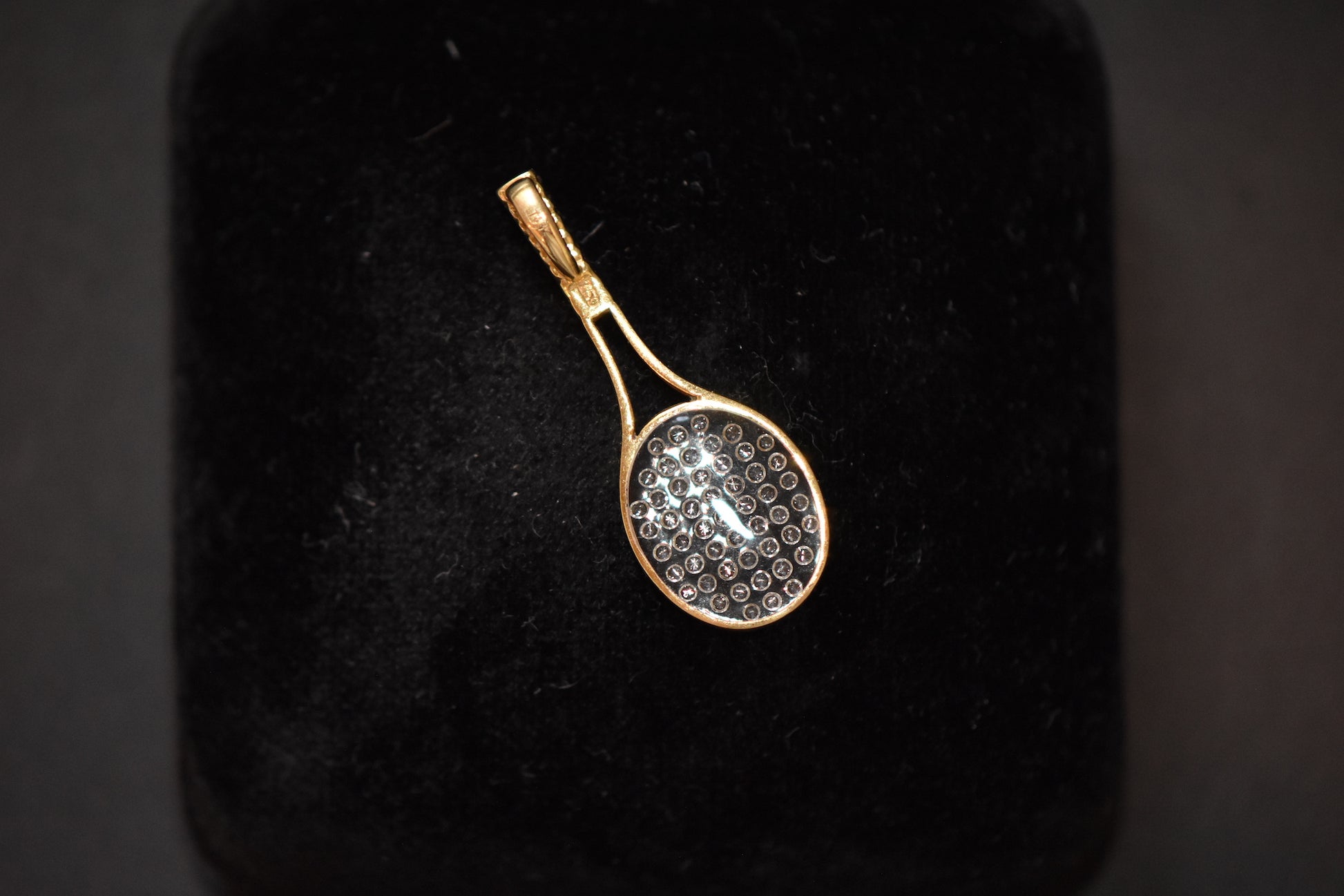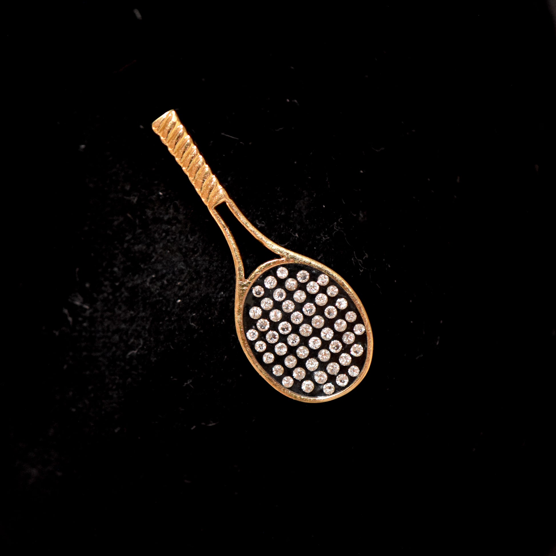 Playful estate tennis racket pendant set with brilliant white spinels in lucite and crafted in 18K yellow gold.