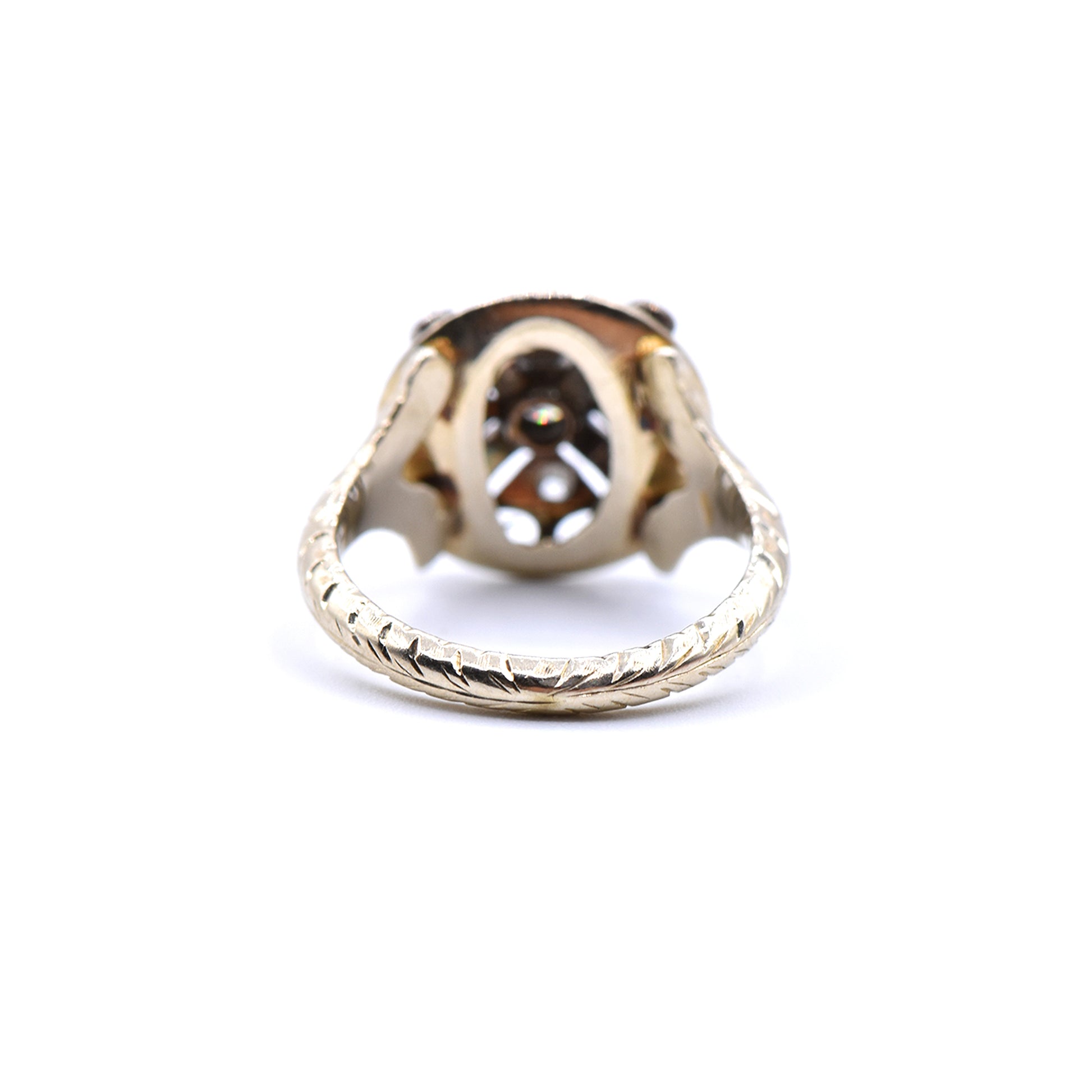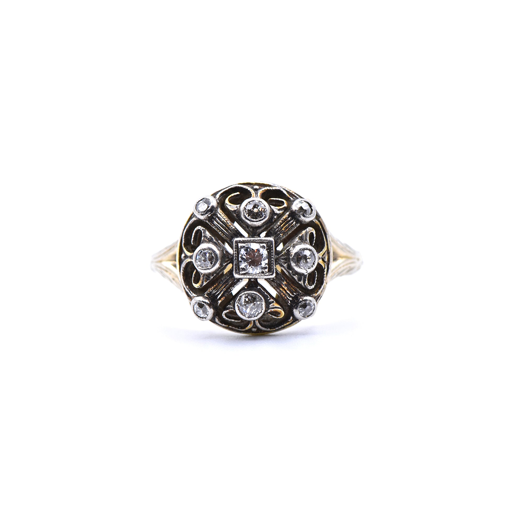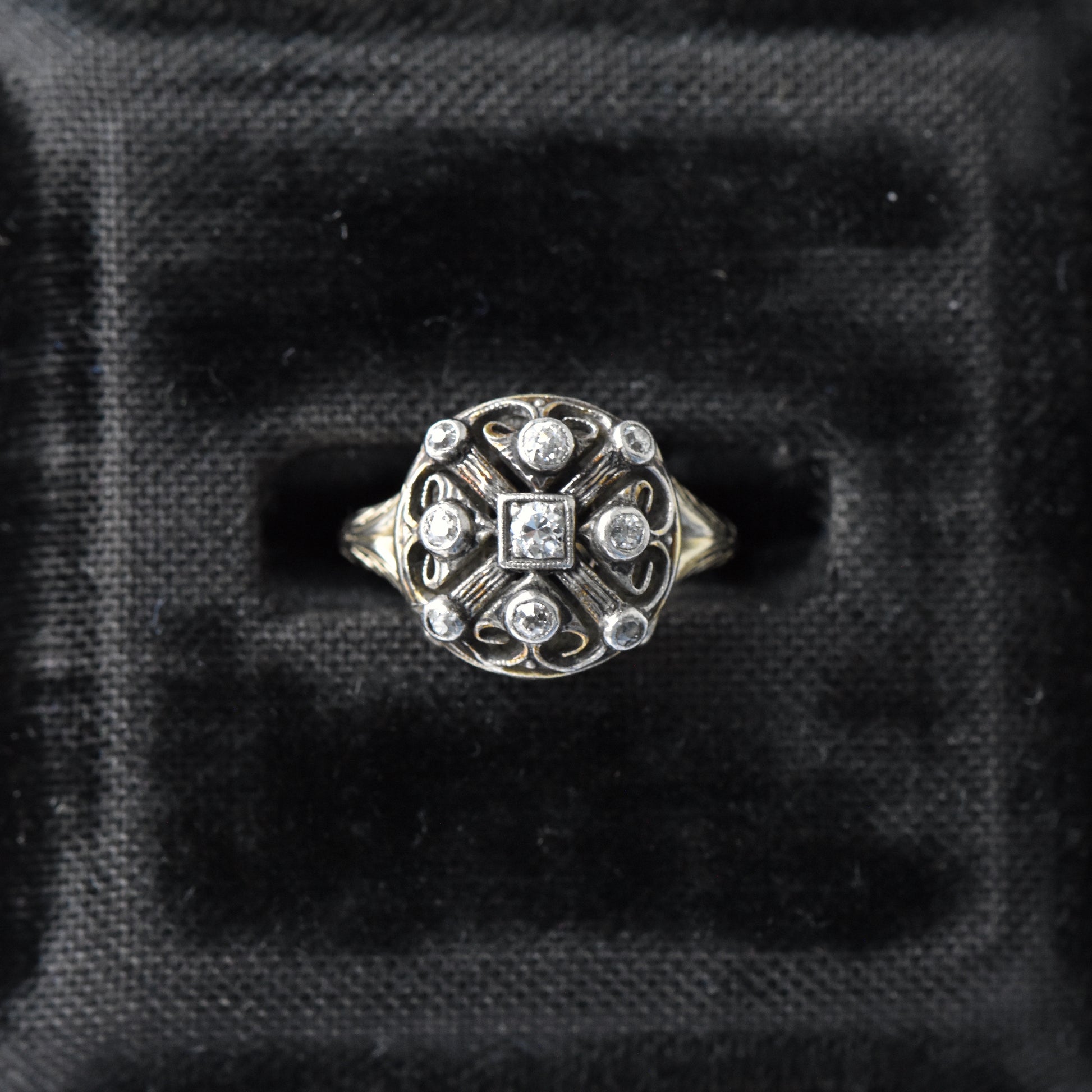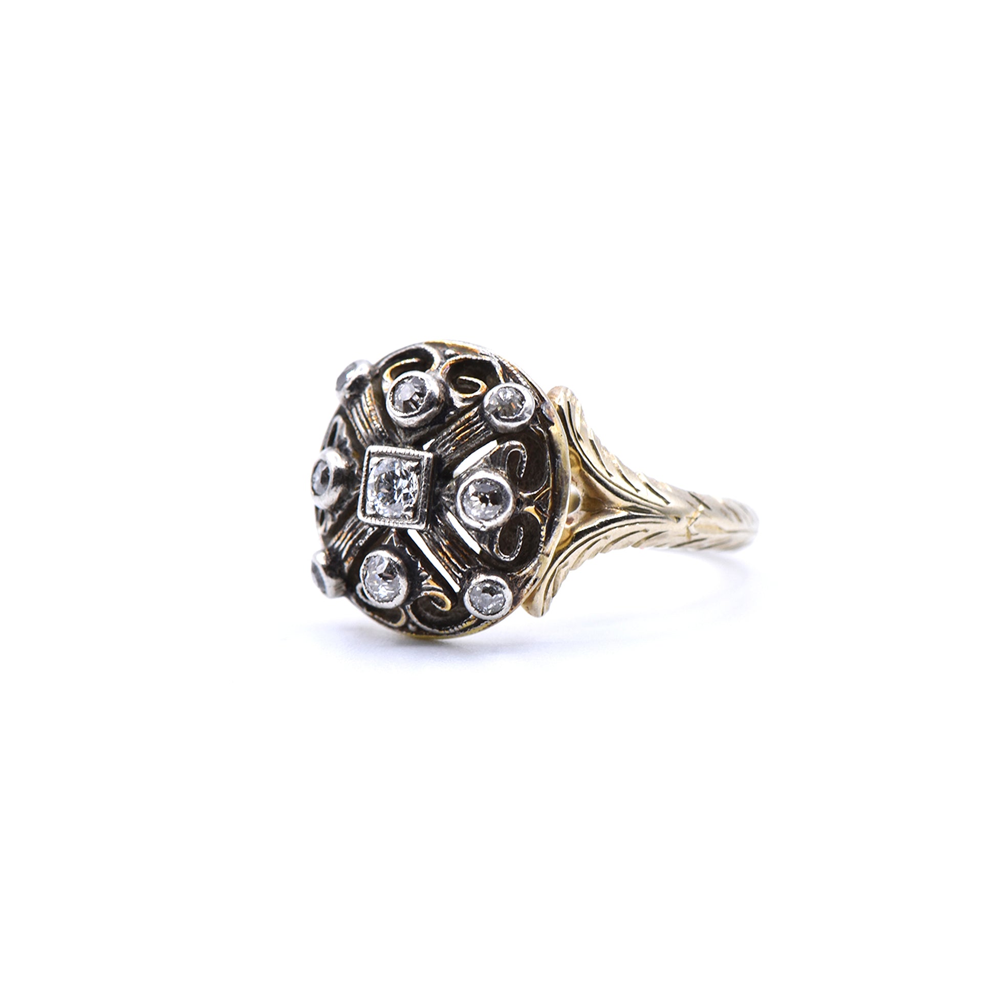 Description: Victorian ring with 9 OEC diamonds (est. 0.14ctw) set in silver topped 14K gold.