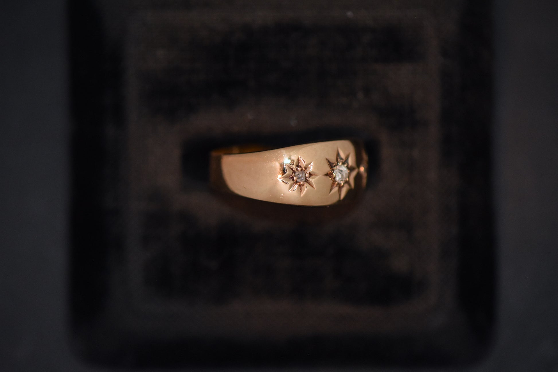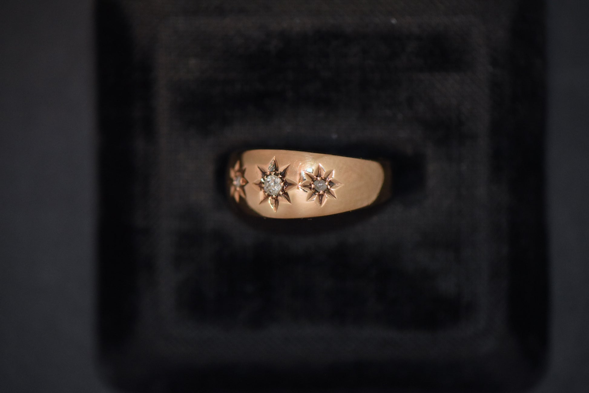 Vintage trilogy gypsy ring set with 3 diamonds in starburst settings, crafted in 18K yellow gold with full UK hallmarks.